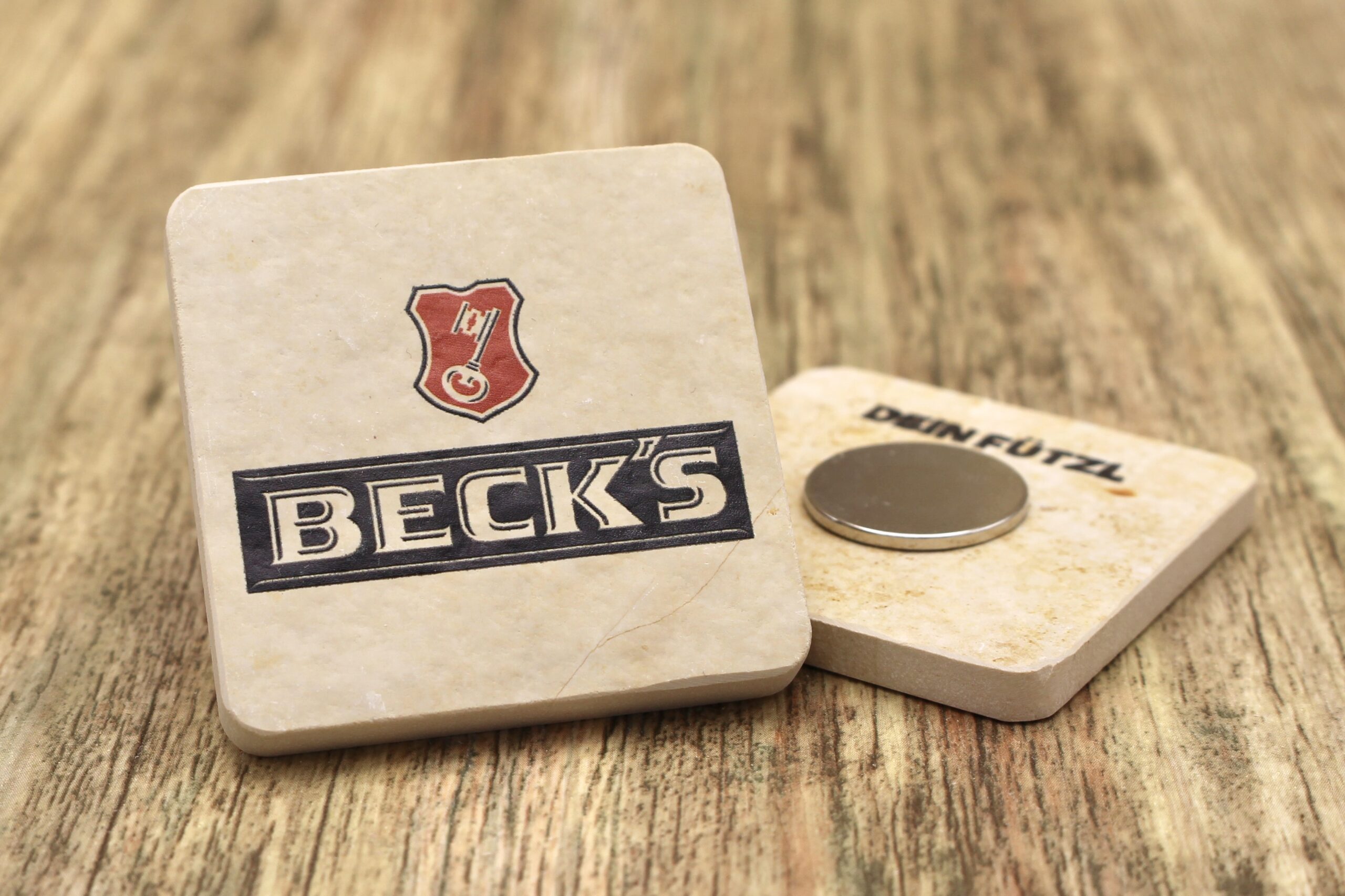 Magnet für den Kühlschrank aus Stein mit dem Logo der Brauerei Becks ✓ Dein Fützl: perfekt als Geschenk & Fanartikel ✓ Echt nachhaltig: Aus Solnhofer Naturstein handgemacht in Bayern ➨ Jetzt bestellen!