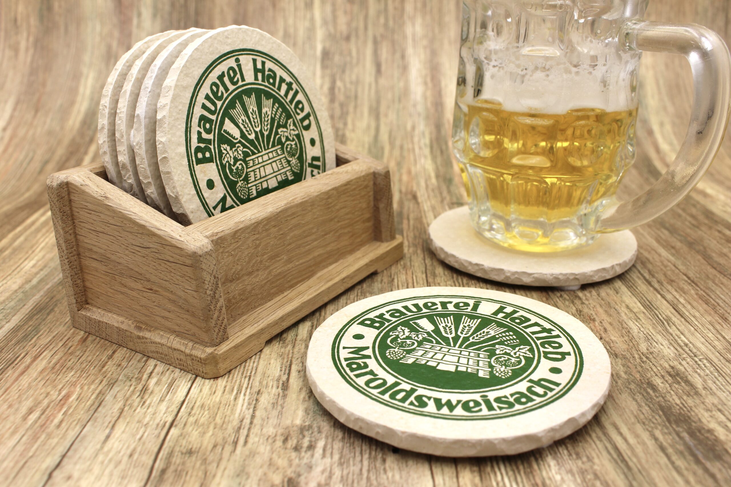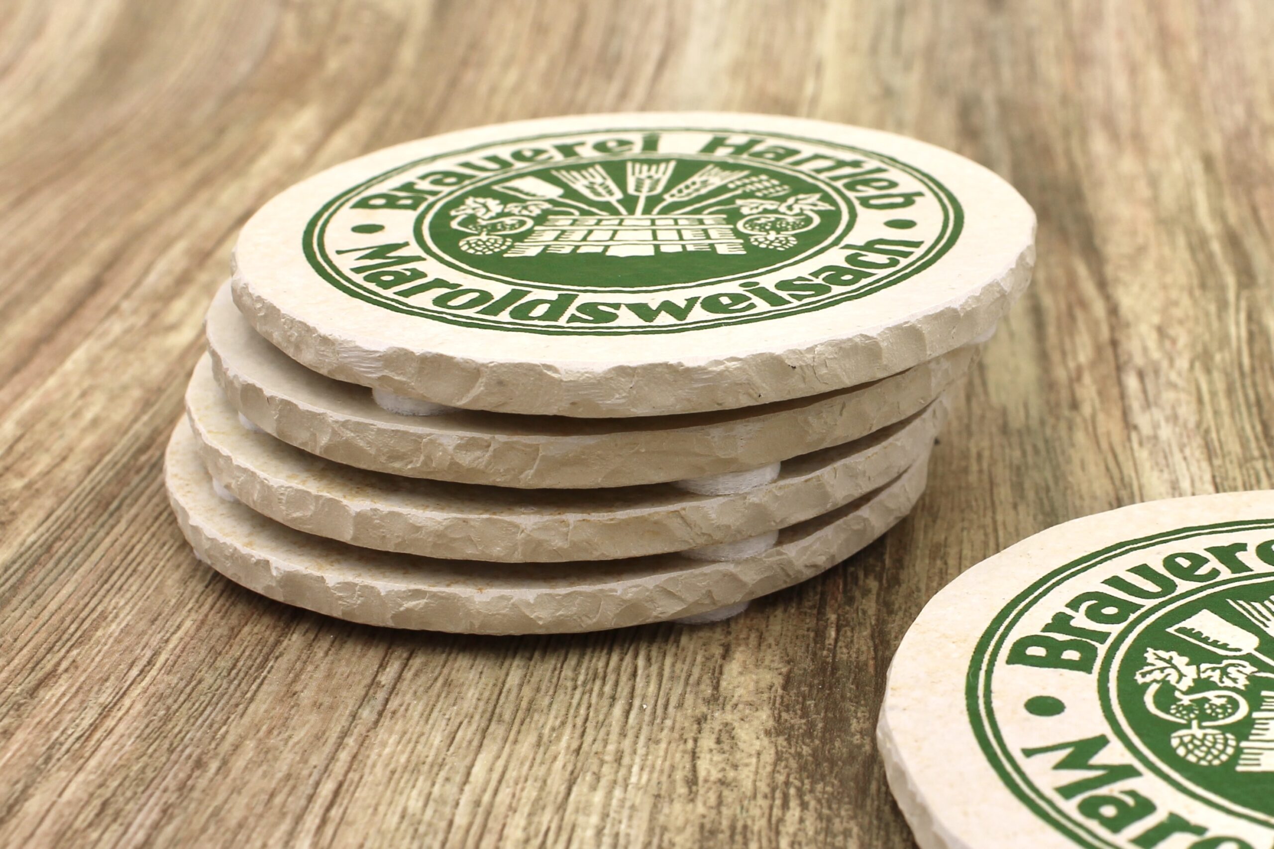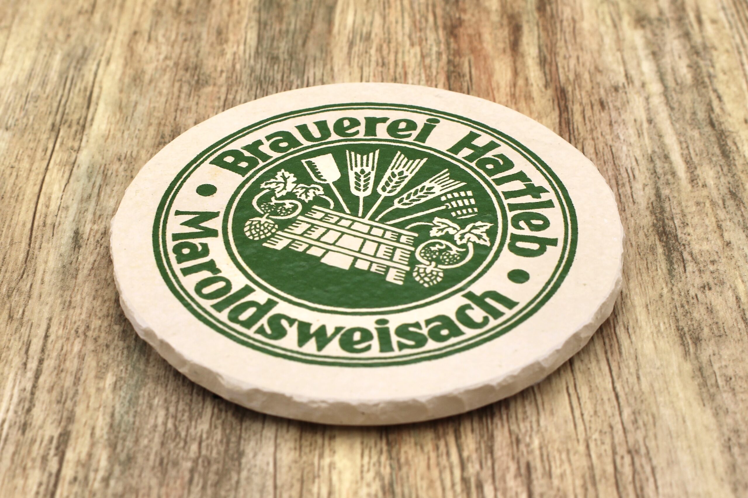Bierdeckel aus Naturstein mit Logo der Brauerei Hartleb aus Maroldsweisach ✓ Dein Fützl: perfekt als Geschenk & Fanartikel & für Sammler ✓ Echt biologisch: Aus Solnhofer Naturstein handgemacht in Bayern ➨ Jetzt bestellen!