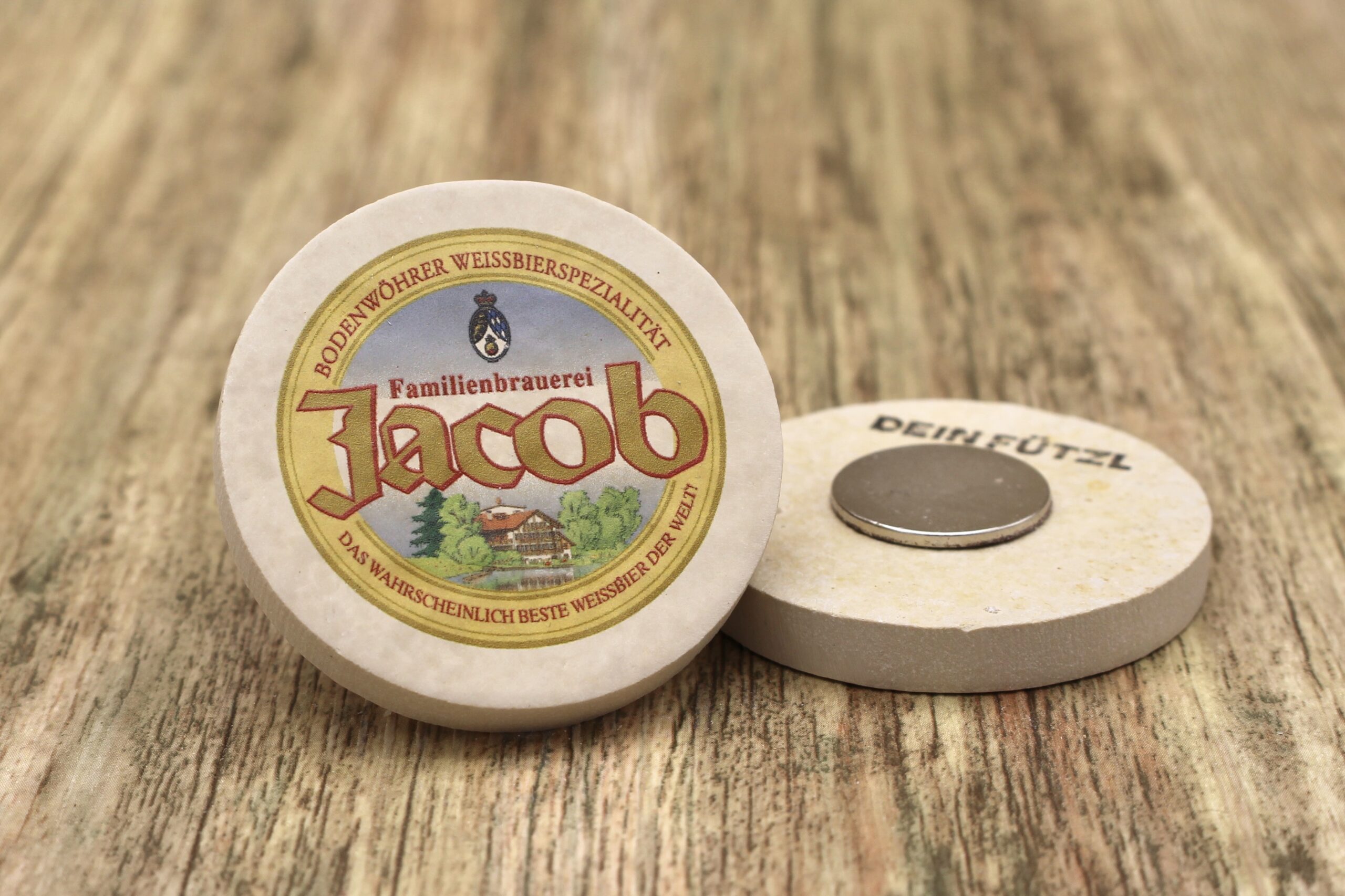 Magnet für den Kühlschrank aus Stein mit dem Logo der Brauerei Jacob ✓ Dein Fützl: perfekt als Geschenk & Fanartikel ✓ Echt nachhaltig: Aus Solnhofer Naturstein handgemacht in Bayern ➨ Jetzt bestellen!