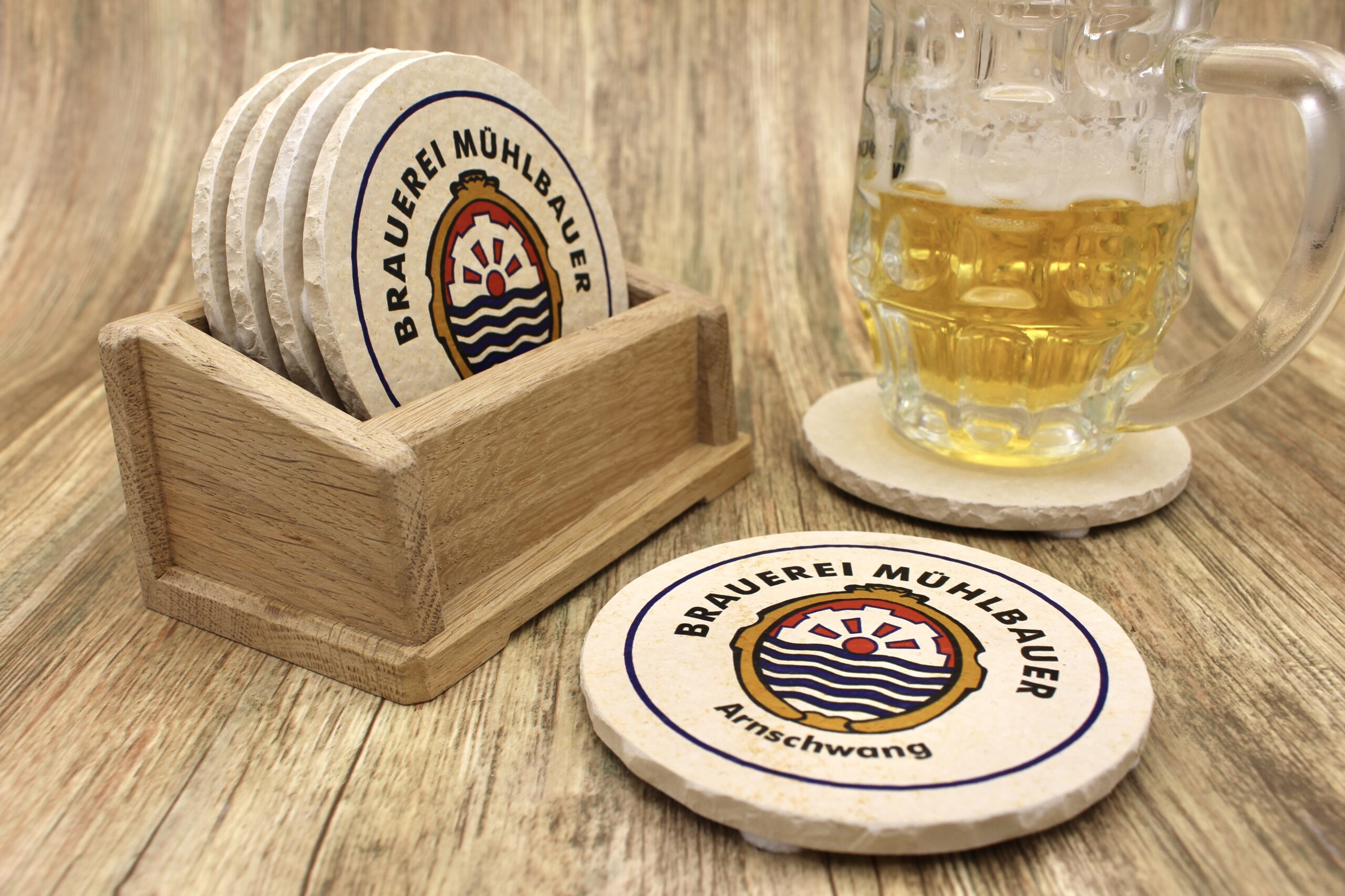 Bierdeckel aus Naturstein mit Logo der Brauerei Mühlbauer aus Arnschwang ✓ Dein Fützl: perfekt als Geschenk & Fanartikel & für Sammler ✓ Echt biologisch: Aus Solnhofer Naturstein handgemacht in Bayern ➨ Jetzt bestellen!