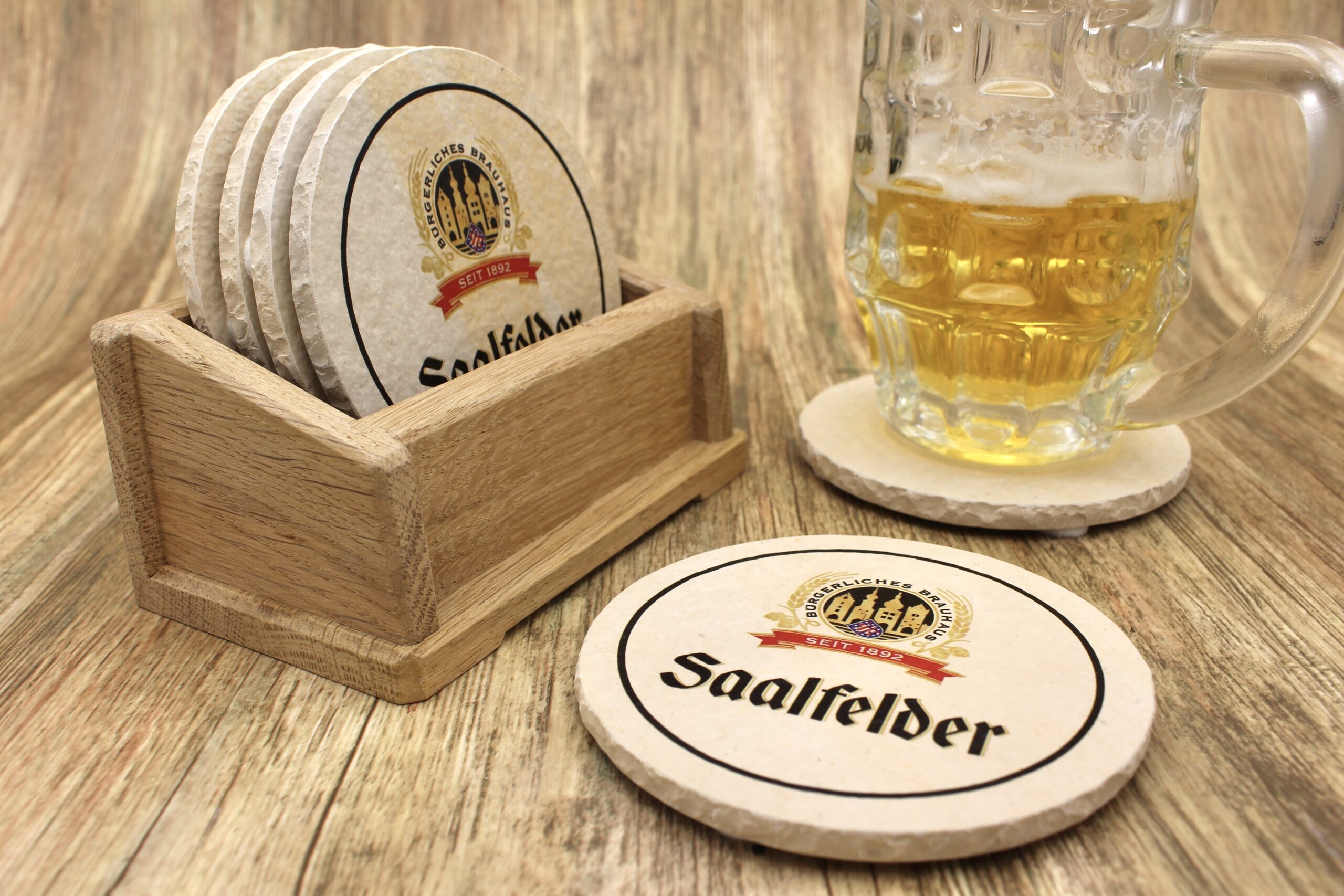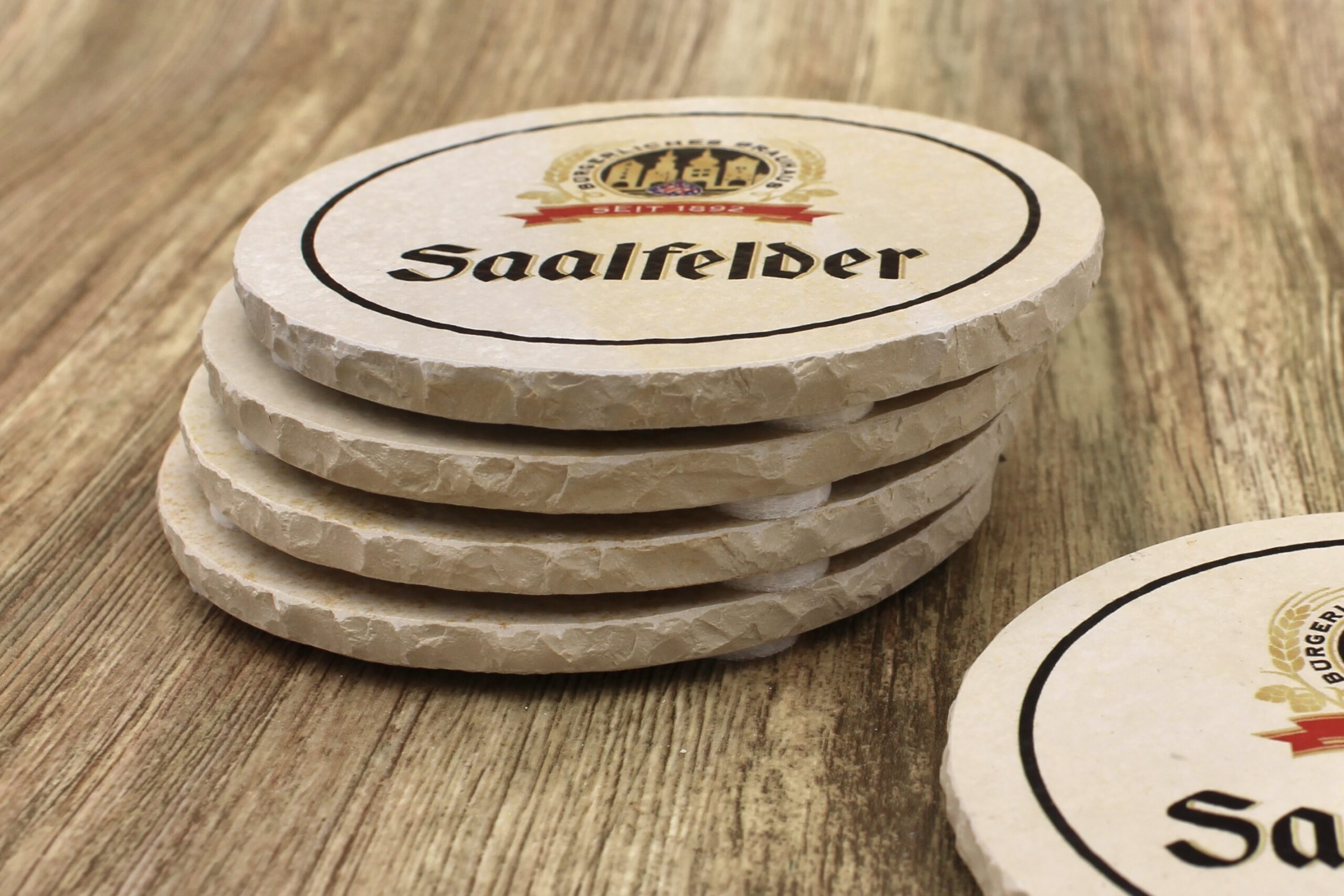 Bierdeckel aus Naturstein mit Logo der Brauerei Saalfelder ✓ Dein Fützl: perfekt als Geschenk & Fanartikel & für Sammler ✓ Echt biologisch: Aus Solnhofer Naturstein handgemacht in Bayern ➨ Jetzt bestellen!