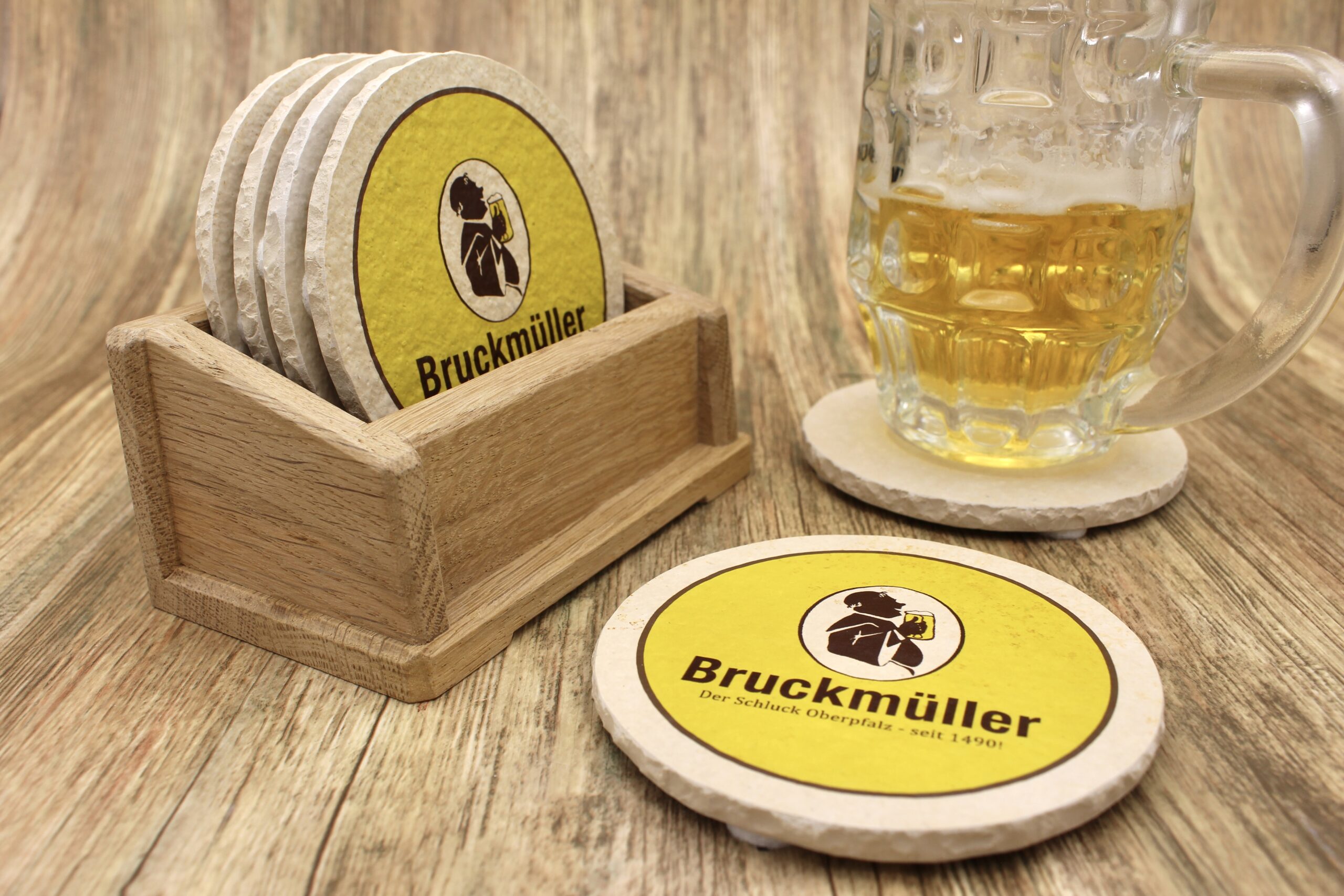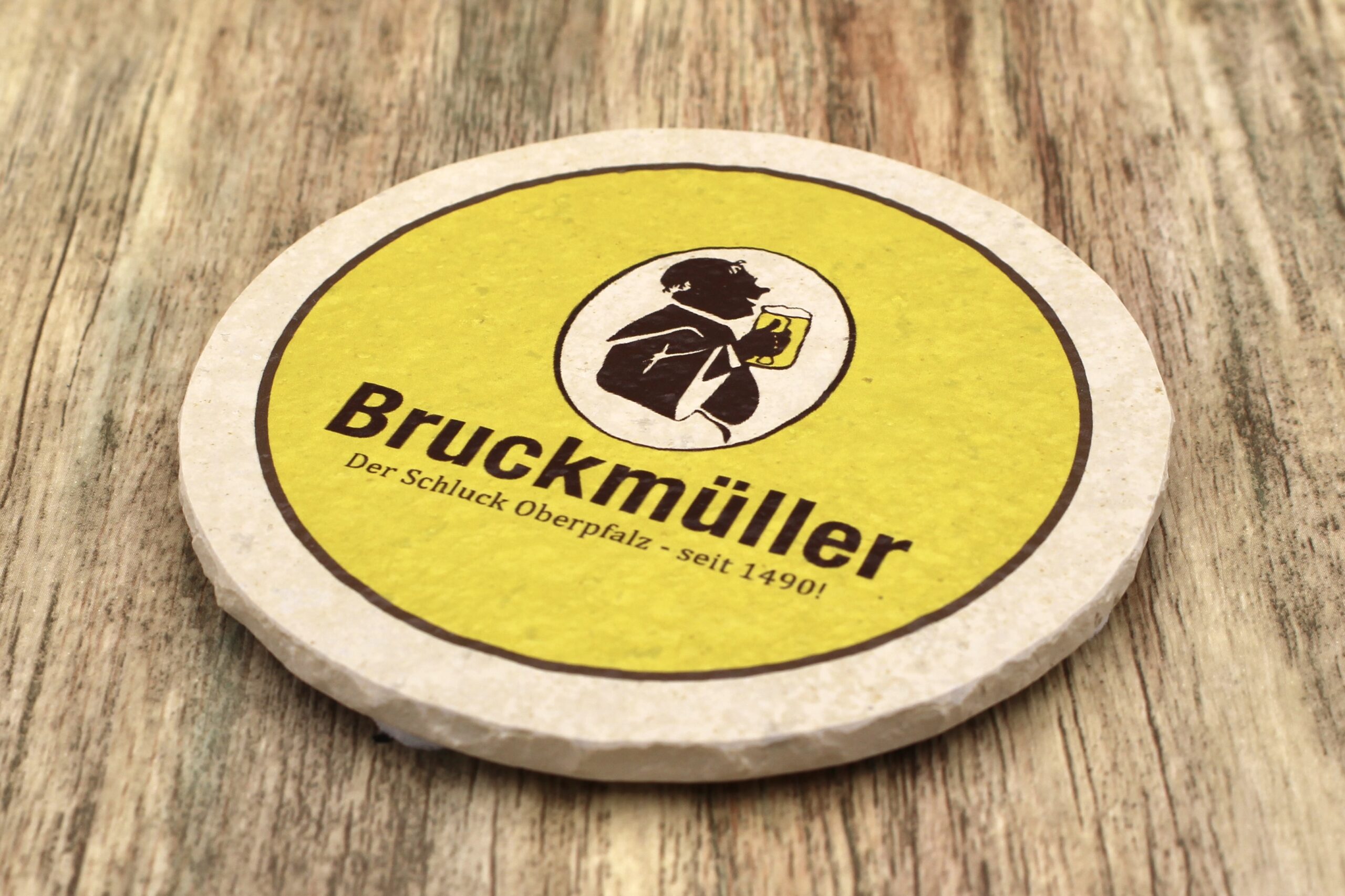 Bierdeckel aus Naturstein mit Logo der Brauerei Bruckmüller aus Amberg ✓ Dein Fützl: perfekt als Geschenk & Fanartikel & für Sammler ✓ Echt biologisch: Aus Solnhofer Naturstein handgemacht in Bayern ➨ Jetzt bestellen!