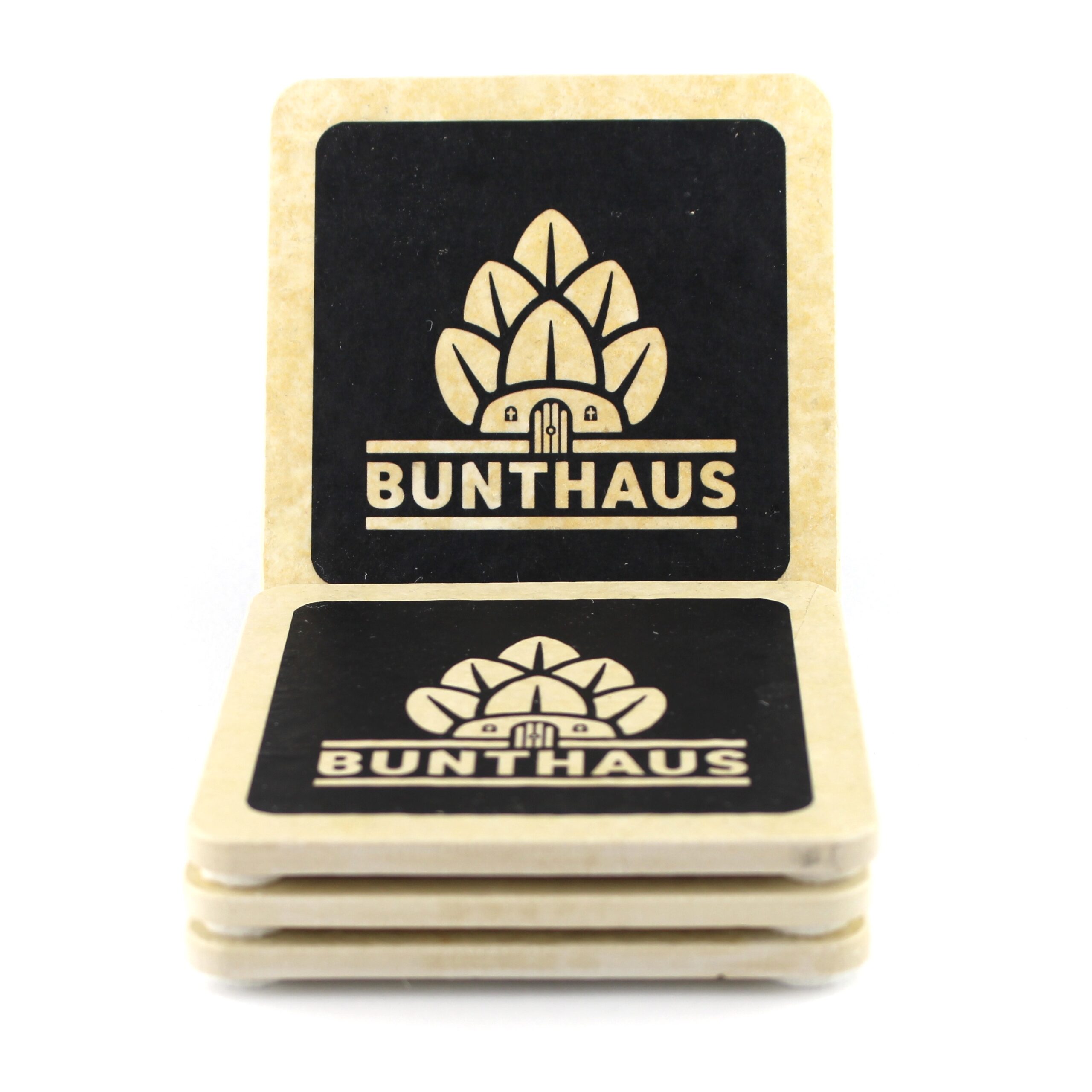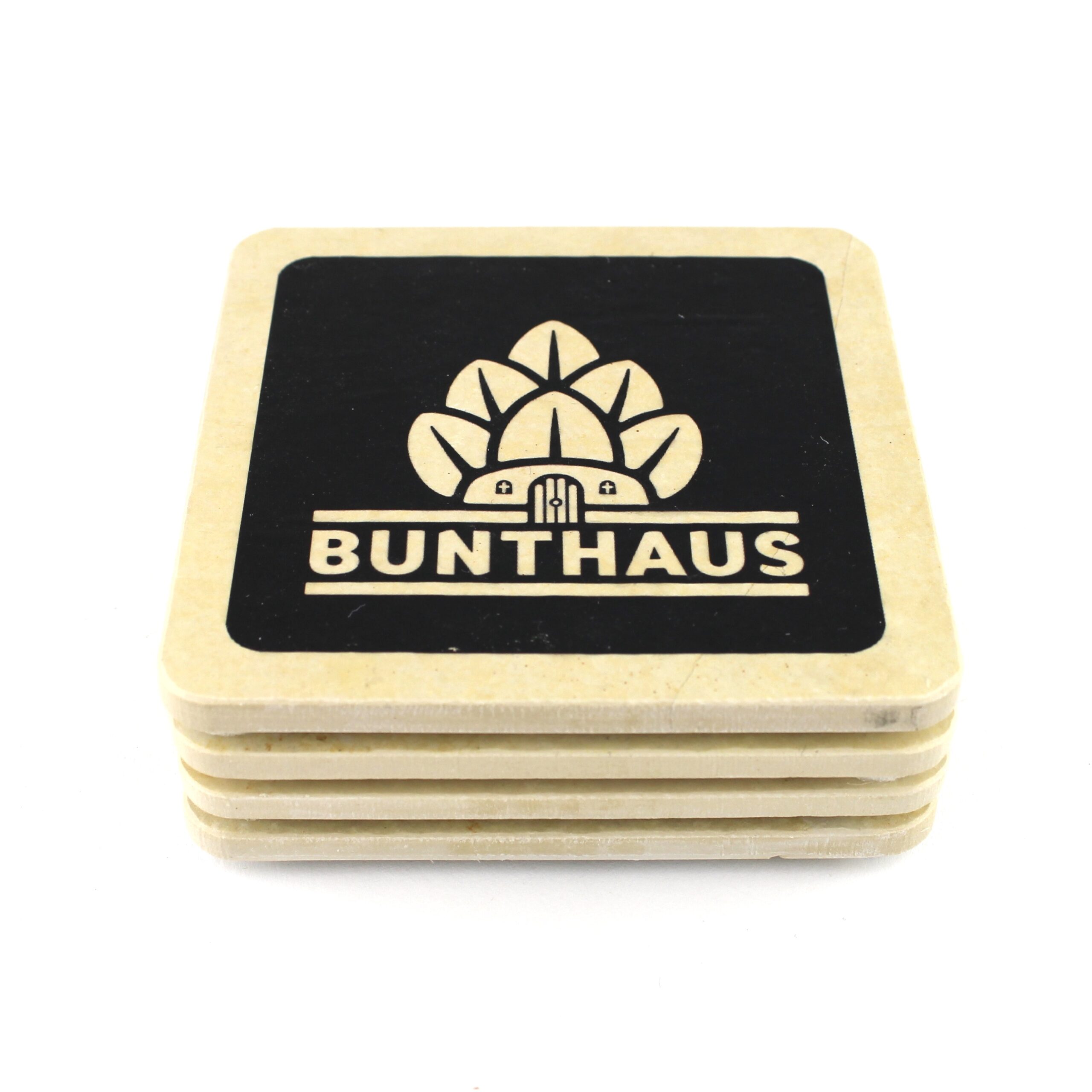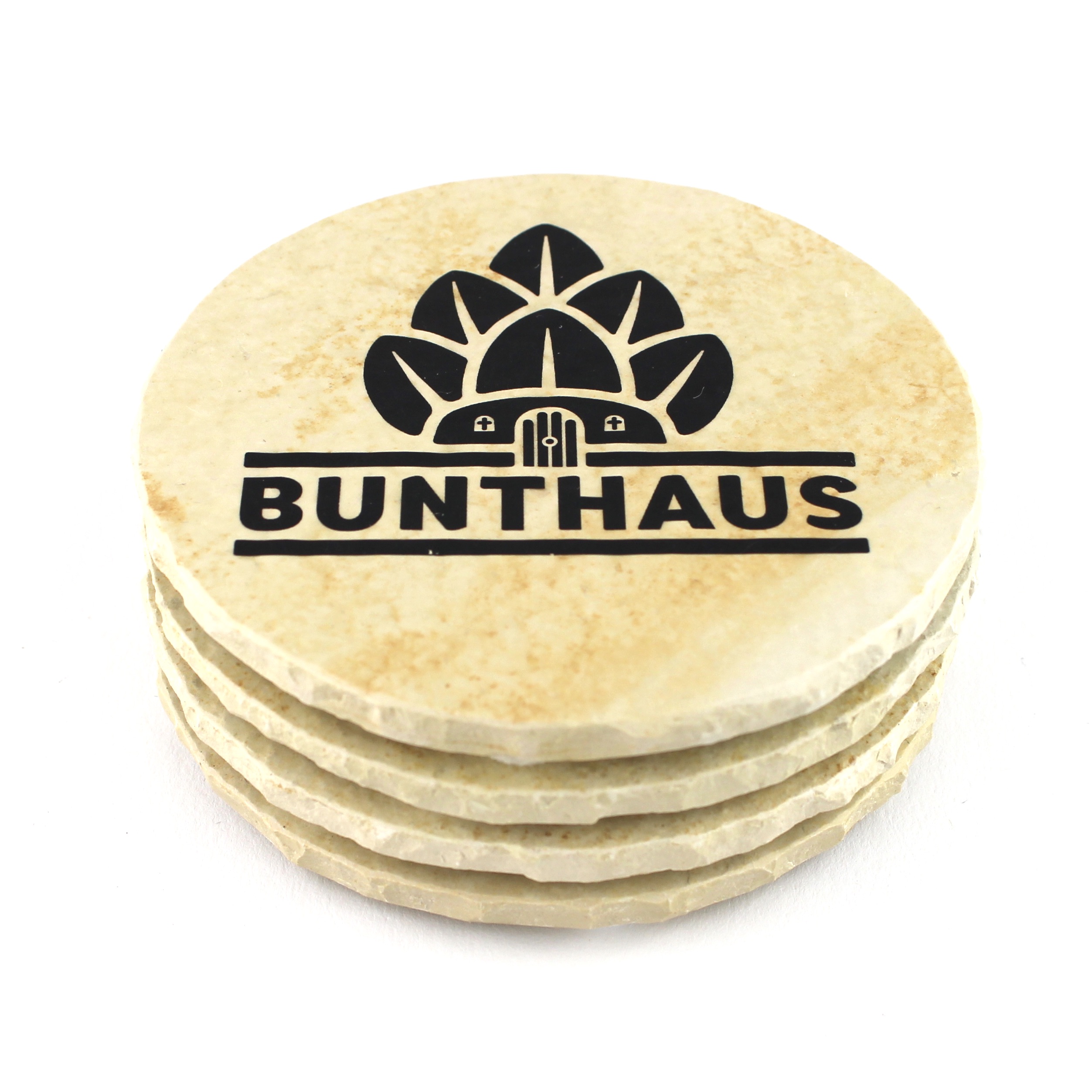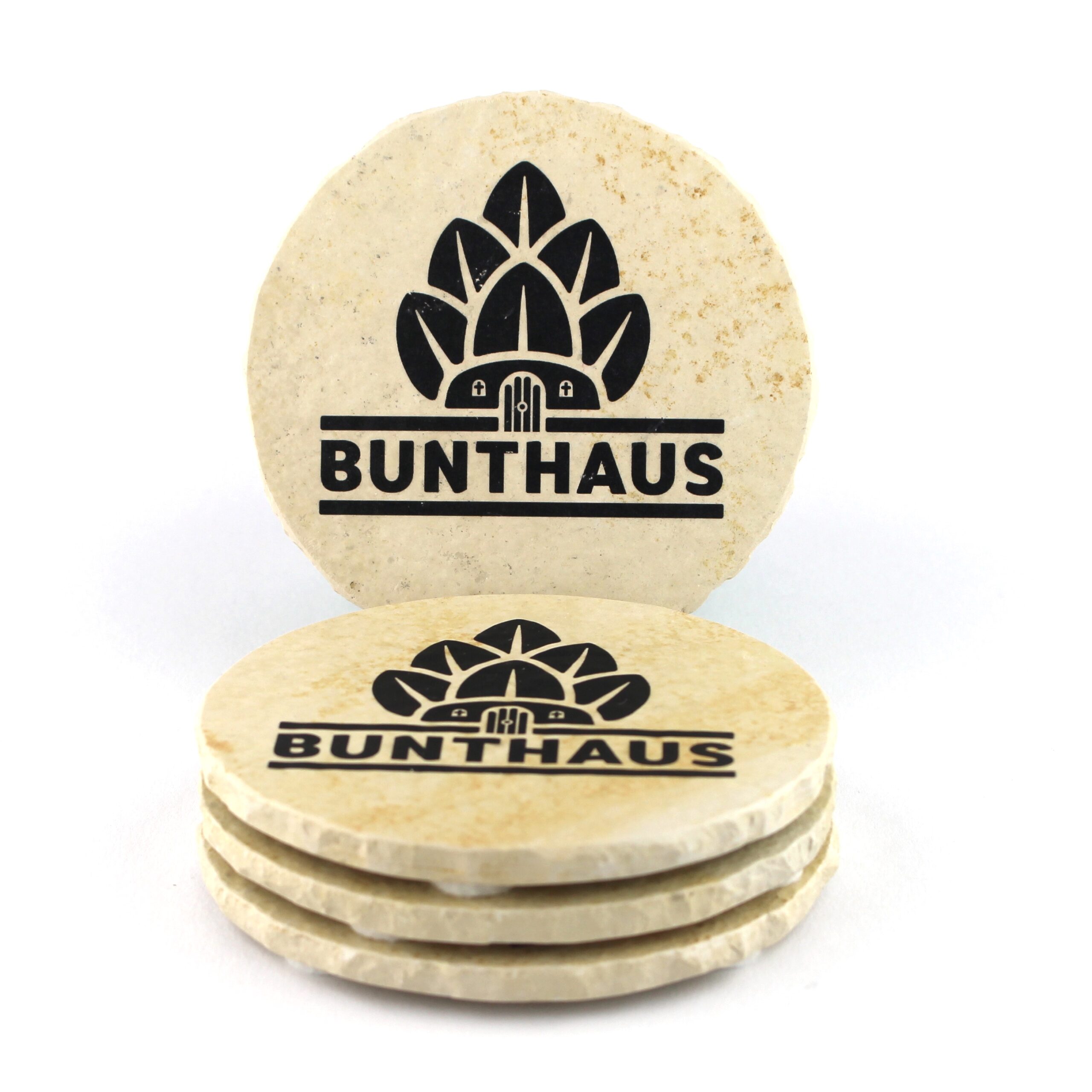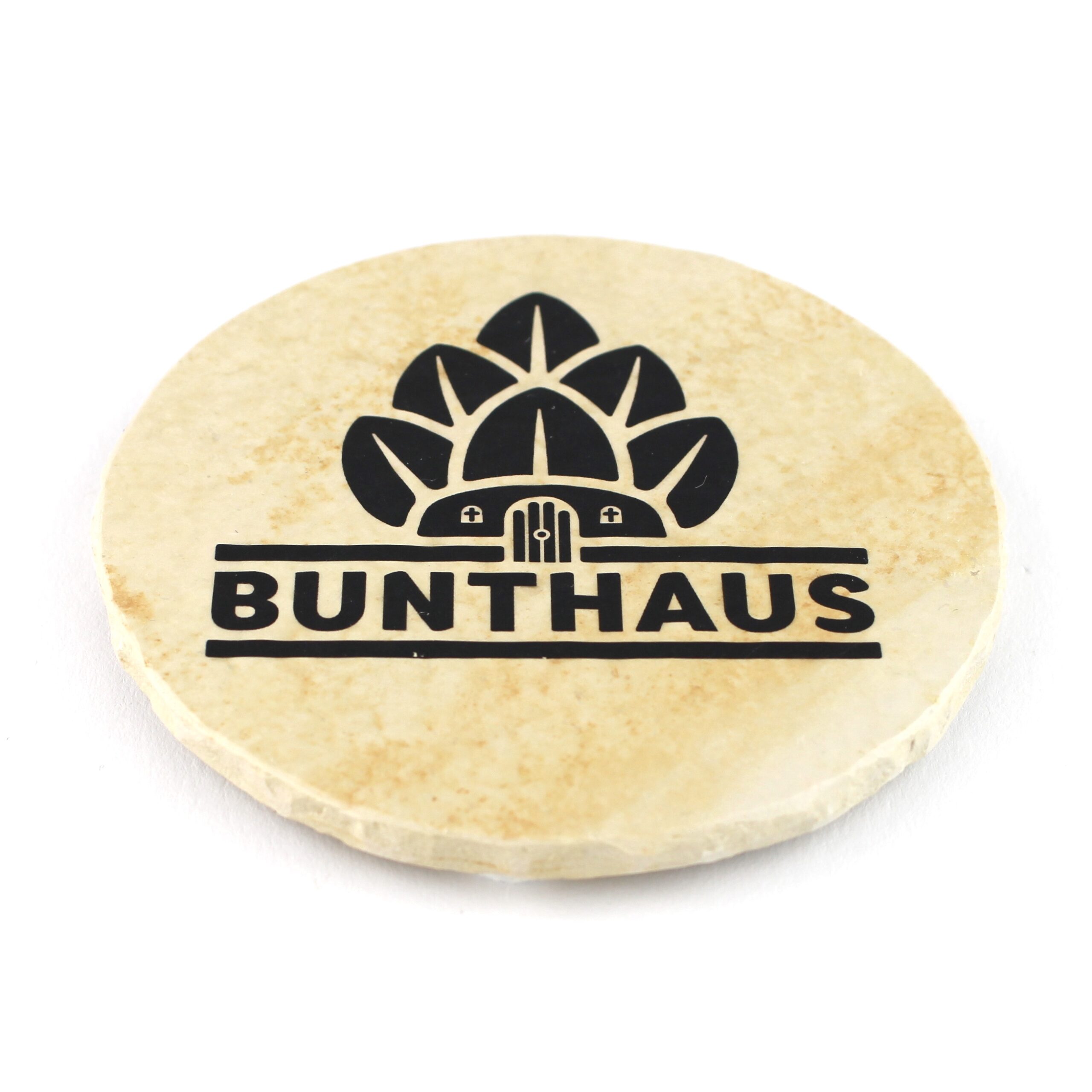 Bunthaus, Steinuntersetzer handgefertigt in Bayern, Natursteinuntersetzer aus Bayern, Regional hergestellte Steinbierdeckel, rein biologischer Solnhofer Naturstein, nachhaltiger Glasuntersetzer, multifunktionales Wohnaccessoire, praktisch beschichtet, daher gesundheitlich unbedenklich, Mit Filzgleitern auf der Unterseite ausgestattet um Kratzer auf Oberflächen zu vermeiden.