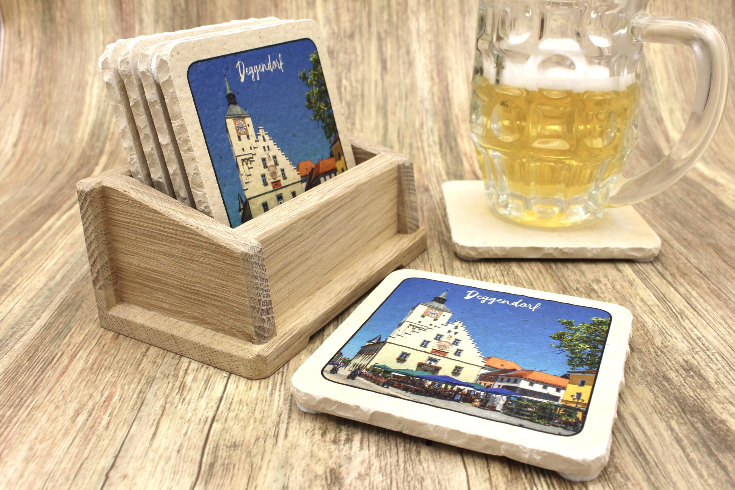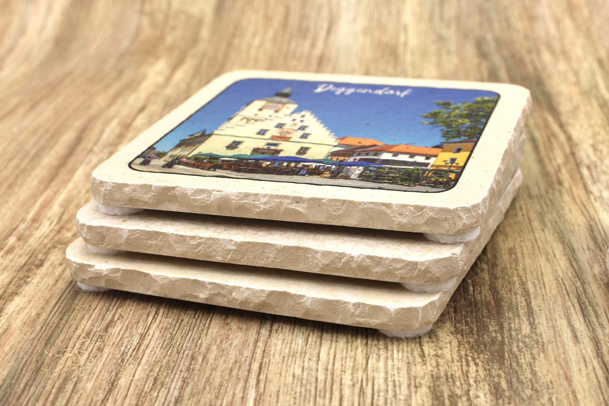 Untersetzer aus Naturstein mit dem Motiv Deggendorf ✓ Dein Fützl: perfekt als Geschenk & Fanartikel & für Sammler ✓ Echt biologisch: Aus Solnhofer Naturstein handgemacht in Bayern ➨ Jetzt bestellen!