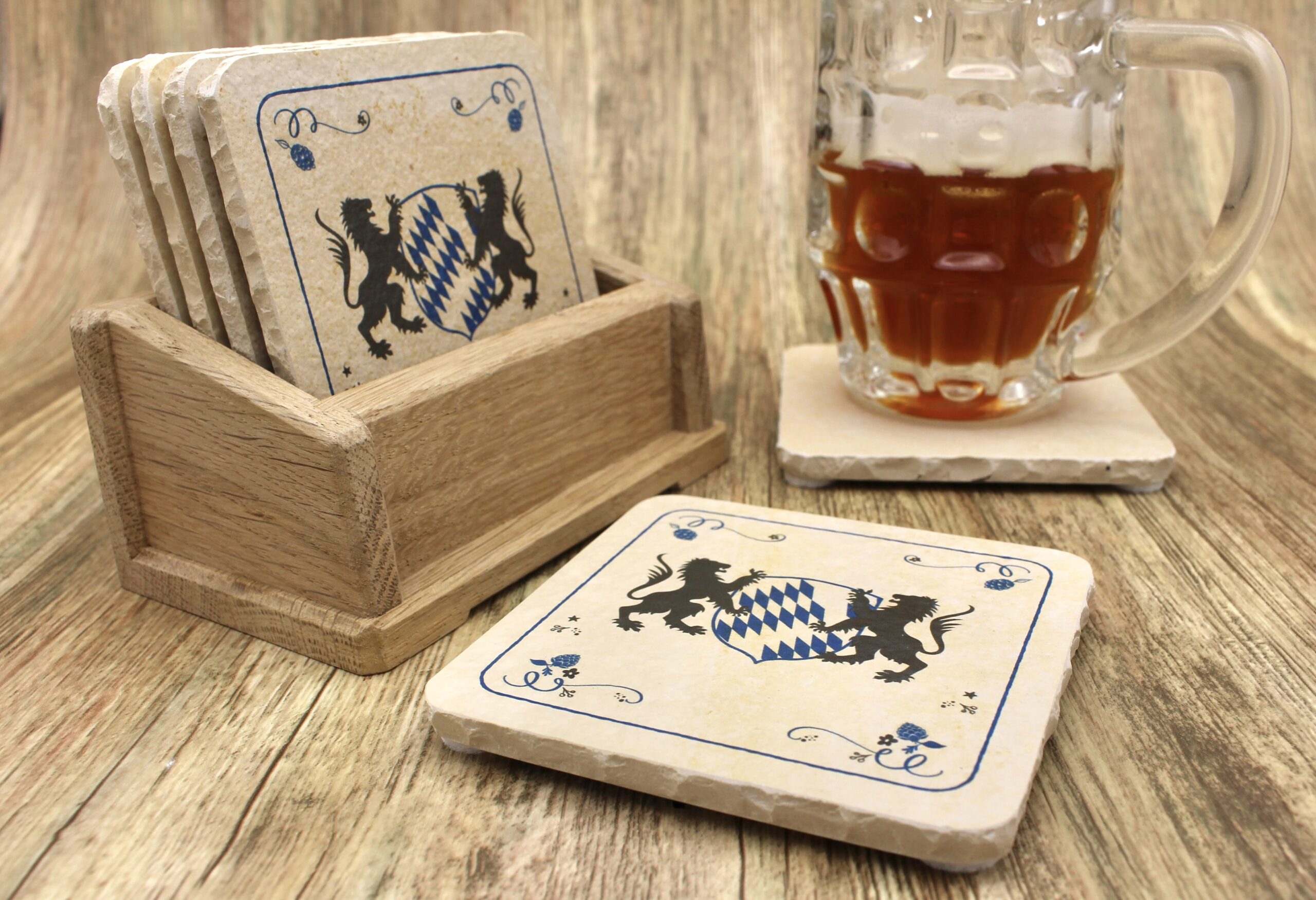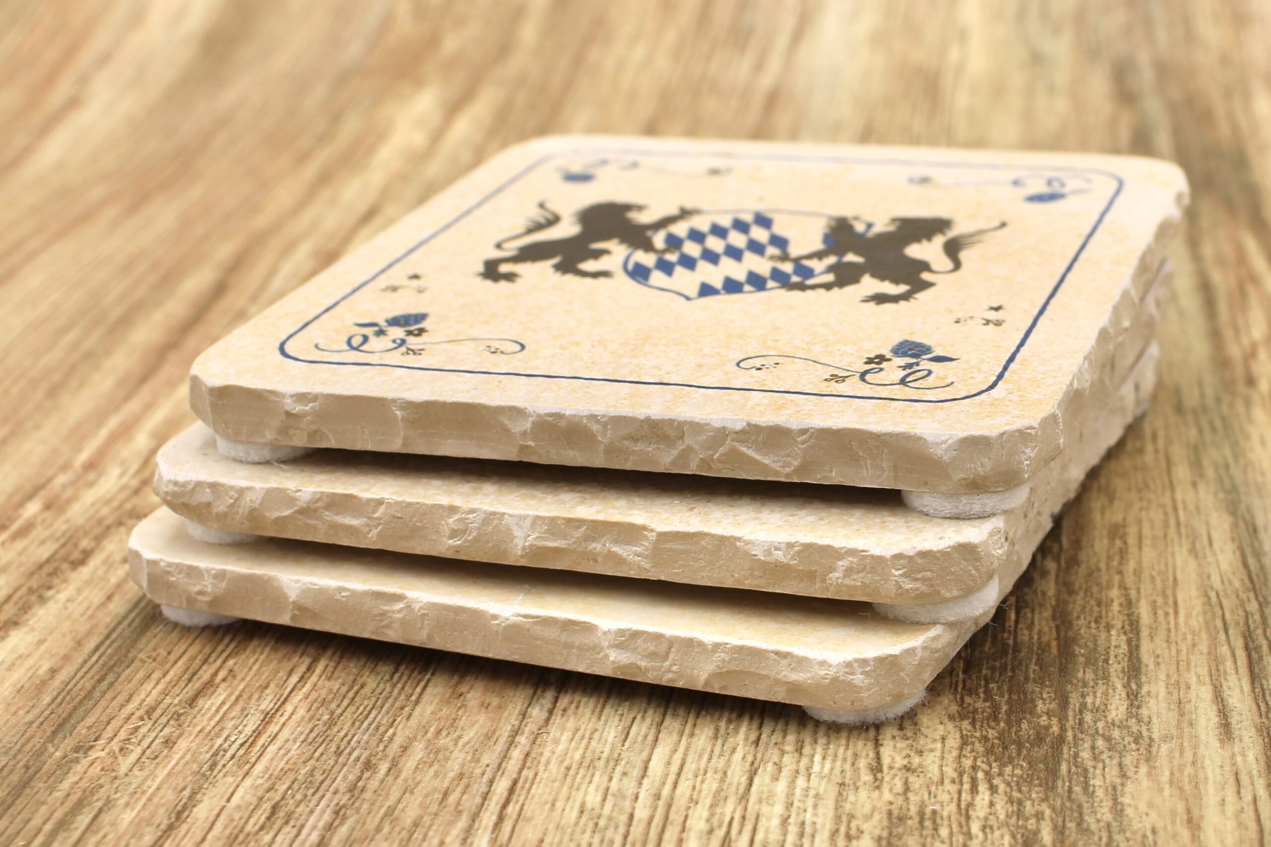 Untersetzer aus Naturstein mit dem Motiv „Bayern Wappen verziert“ ✓ Dein Fützl: perfekt als Geschenk & Fanartikel & für Sammler ✓ Echt biologisch: Aus Solnhofer Naturstein handgemacht in Bayern ➨ Jetzt bestellen!