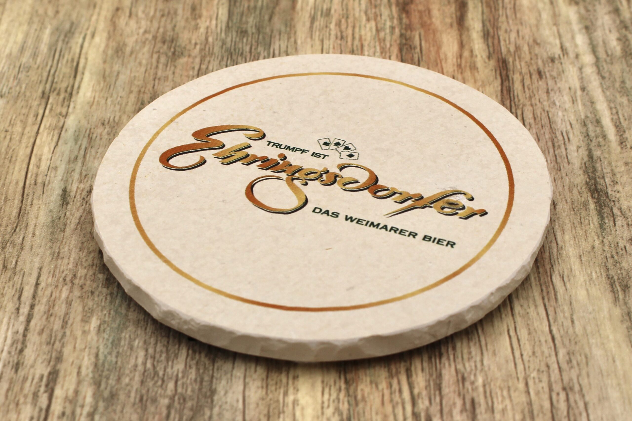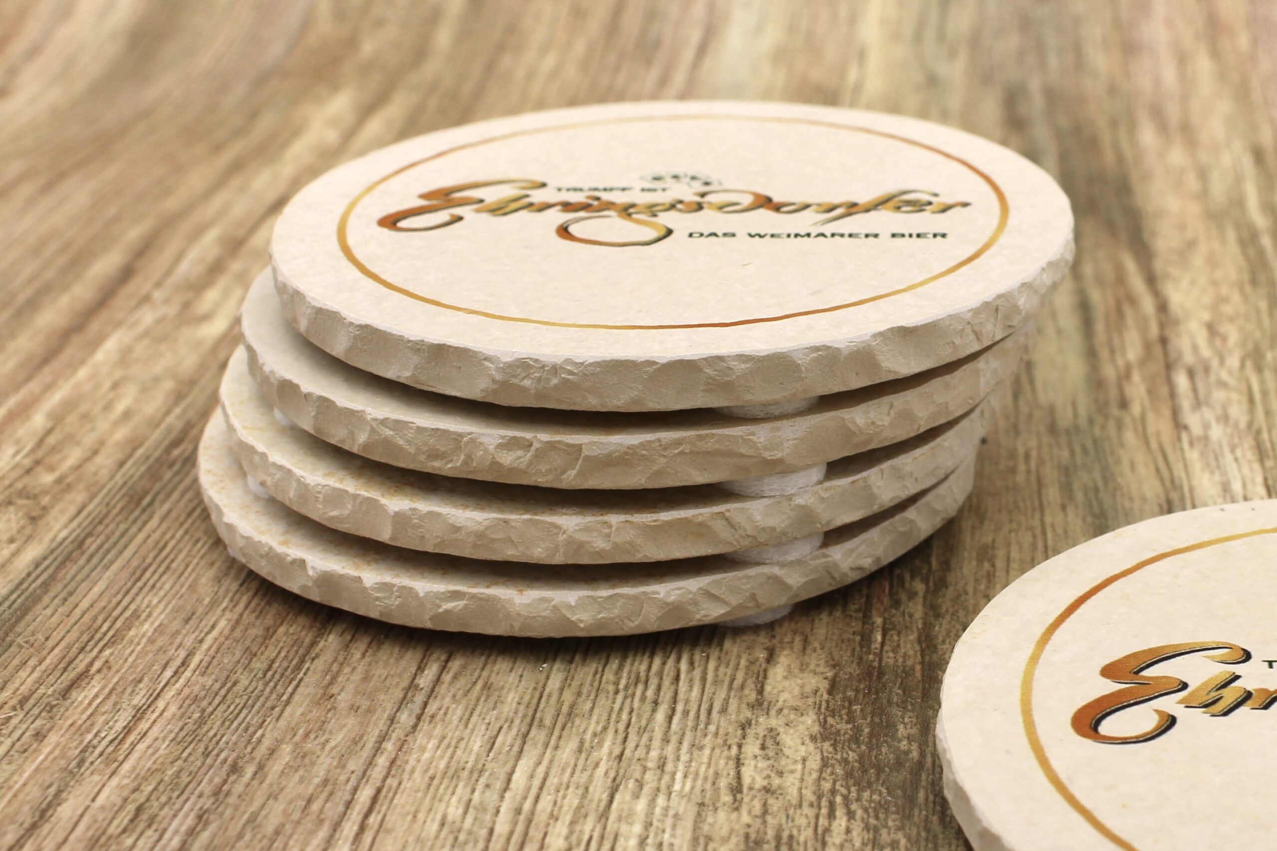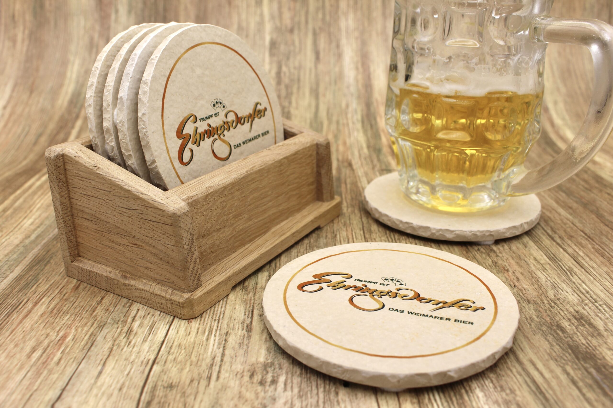 Bierdeckel aus Naturstein mit Logo der Brauerei Ehringsdorfer aus Weimar ✓ Dein Fützl: perfekt als Geschenk & Fanartikel & für Sammler ✓ Echt biologisch: Aus Solnhofer Naturstein handgemacht in Bayern ➨ Jetzt bestellen!