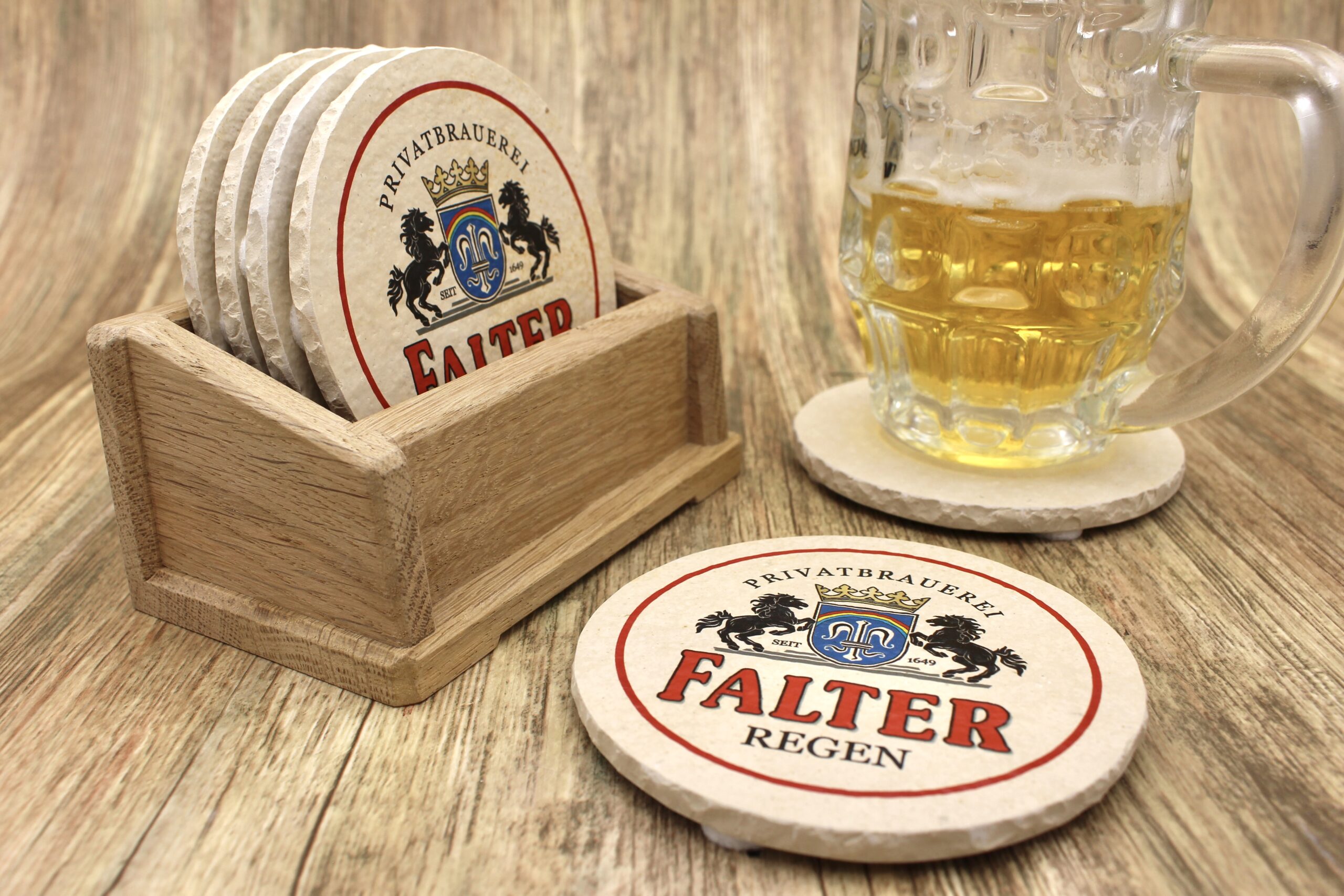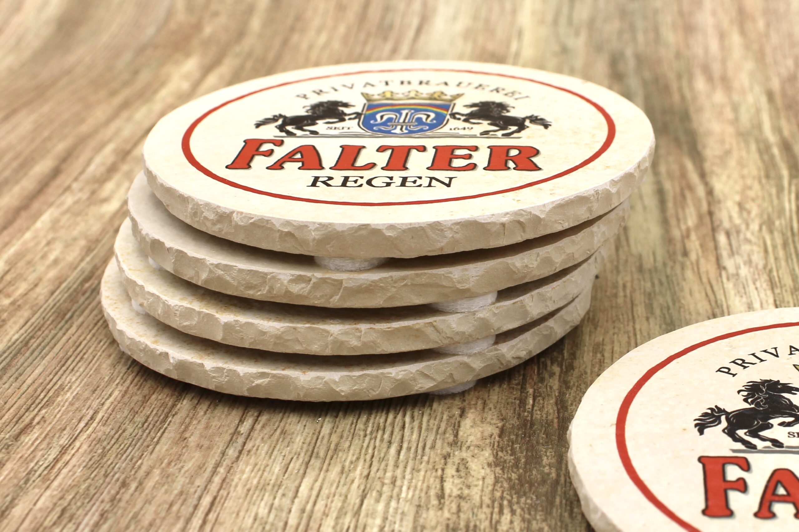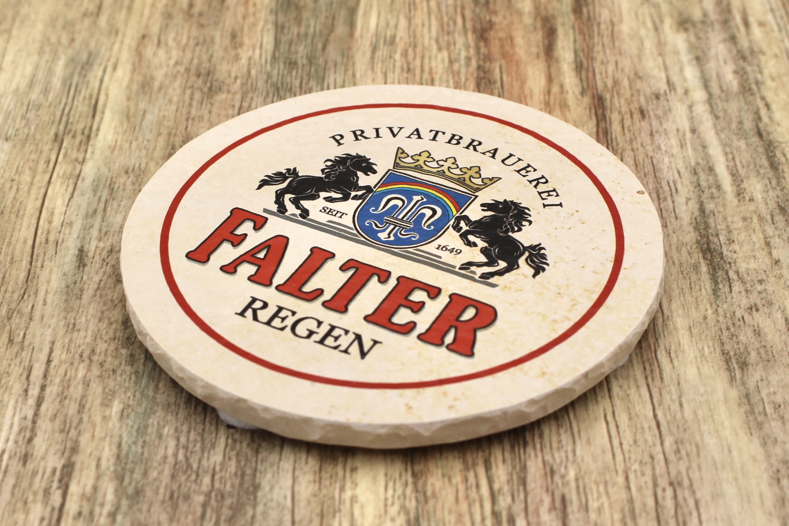 Bierdeckel aus Naturstein mit Logo der Brauerei Falter aus Regen ✓ Dein Fützl: perfekt als Geschenk & Fanartikel & für Sammler ✓ Echt biologisch: Aus Solnhofer Naturstein handgemacht in Bayern ➨ Jetzt bestellen!