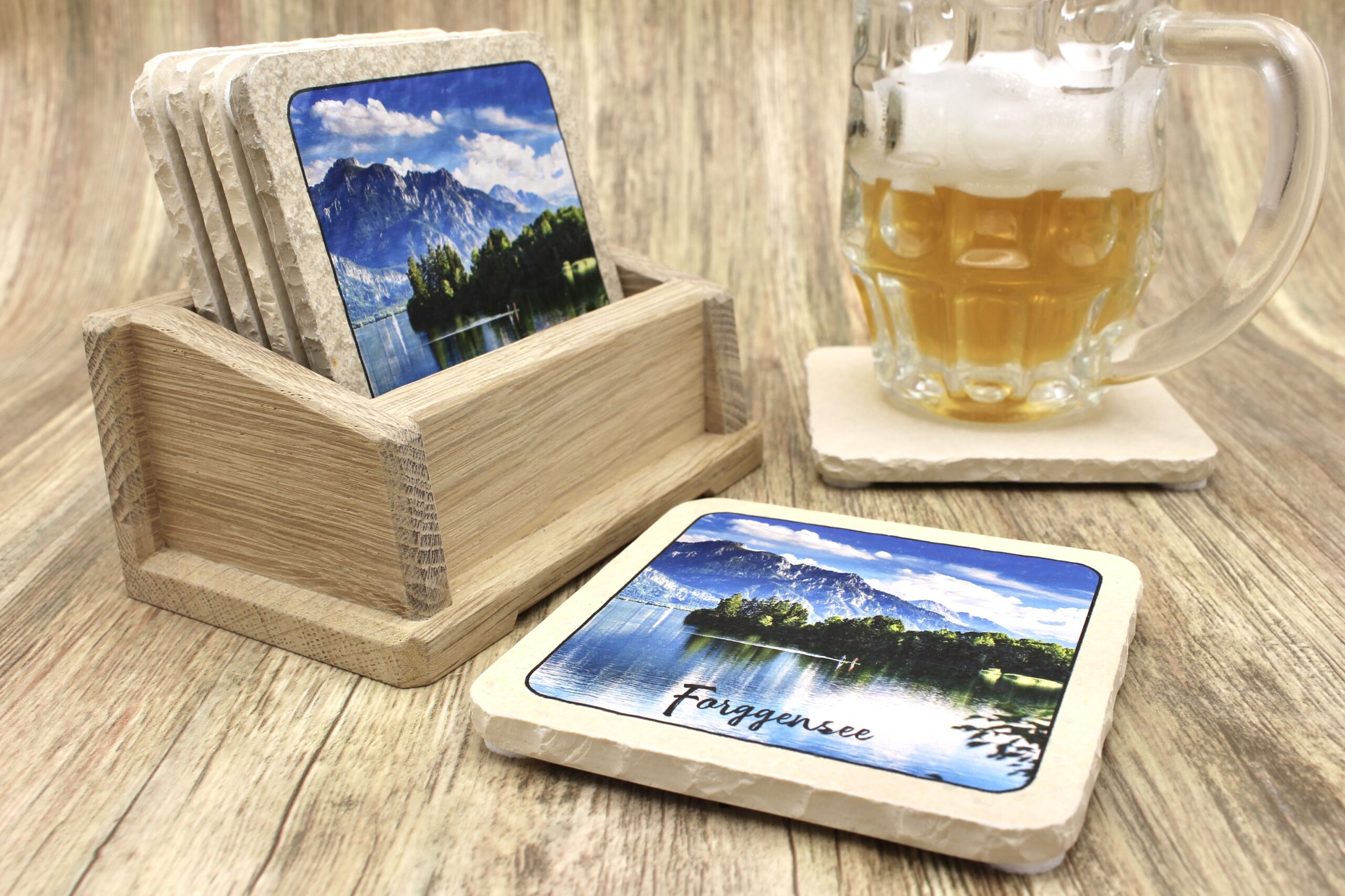 Untersetzer aus Naturstein mit dem Motiv Forggensee ✓ Dein Fützl: perfekt als Geschenk & Fanartikel & für Sammler ✓ Echt biologisch: Aus Solnhofer Naturstein handgemacht in Bayern ➨ Jetzt bestellen!
