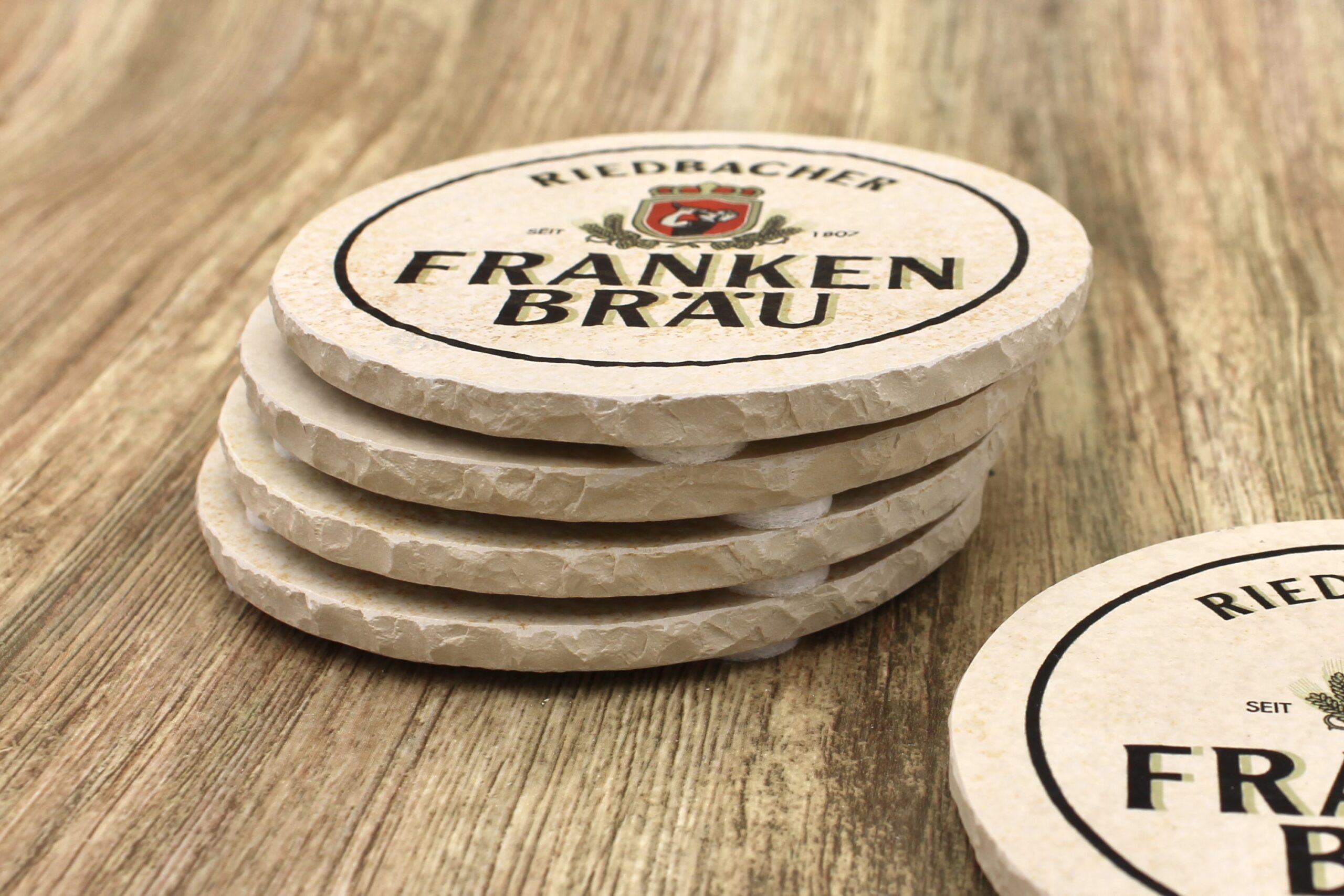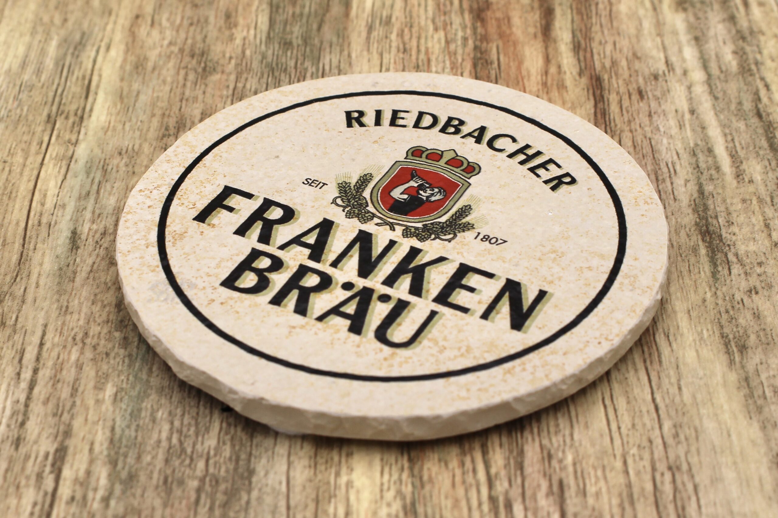 Bierdeckel aus Naturstein mit Logo der Brauerei Frankenbräu aus Riedbach ✓ Dein Fützl: perfekt als Geschenk & Fanartikel & für Sammler ✓ Echt biologisch: Aus Solnhofer Naturstein handgemacht in Bayern ➨ Jetzt bestellen!