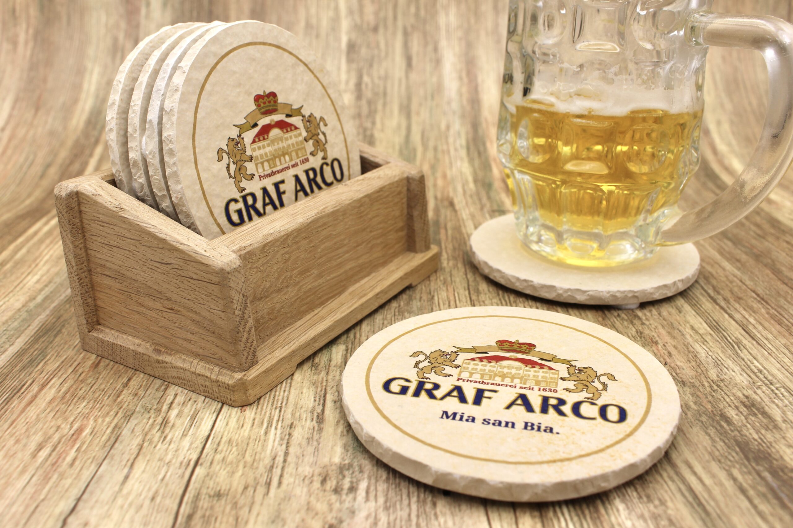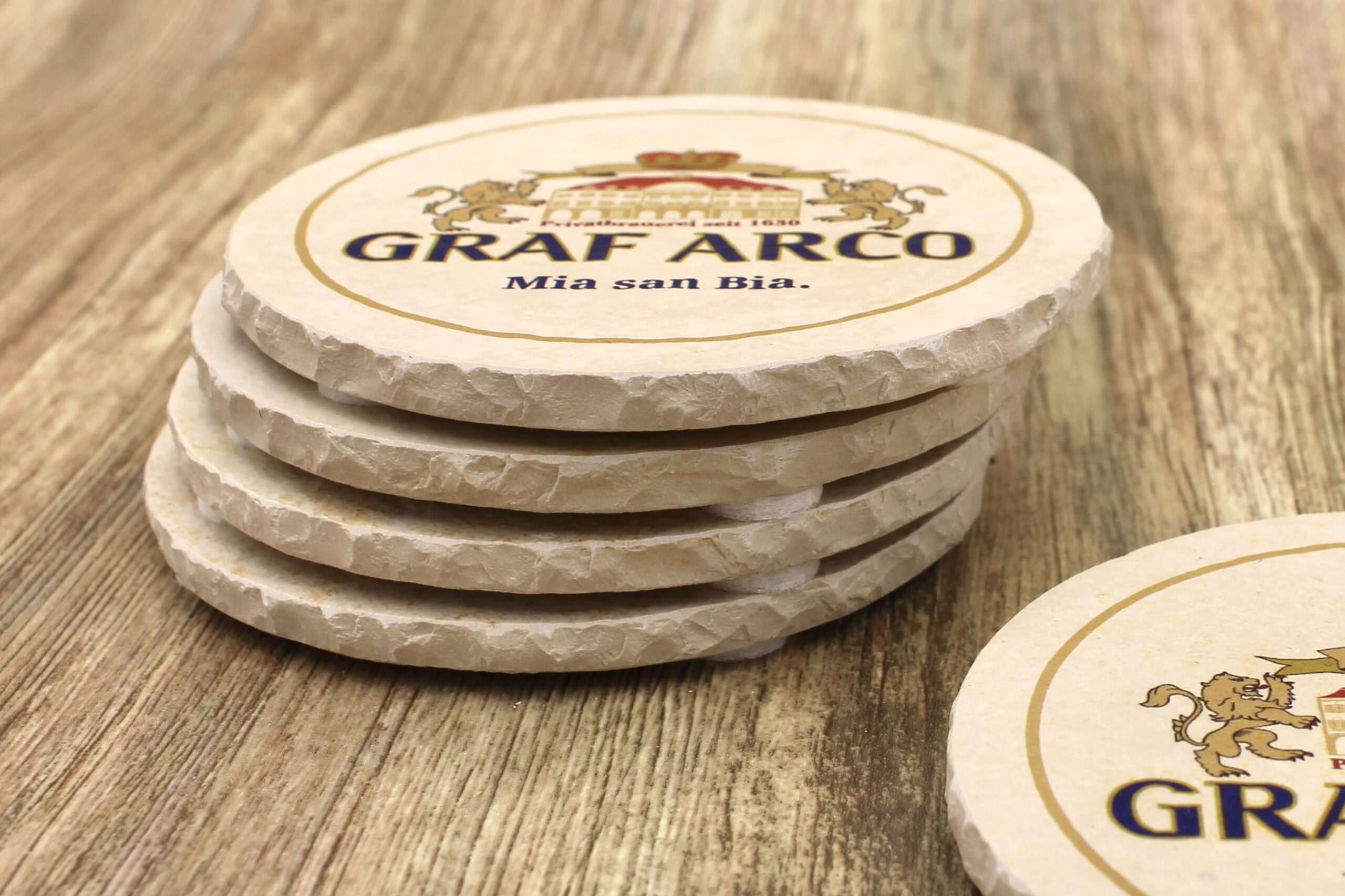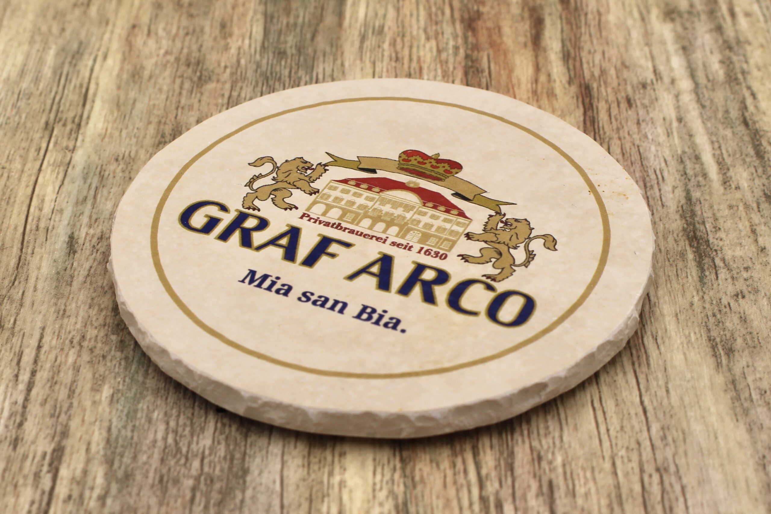 Bierdeckel aus Naturstein mit Logo der Gräflichen Brauerei Arco in Eichendorf ✓ Dein Fützl: perfekt als Geschenk & Fanartikel & für Sammler ✓ Echt biologisch: Aus Solnhofer Naturstein handgemacht in Bayern ➨ Jetzt bestellen!