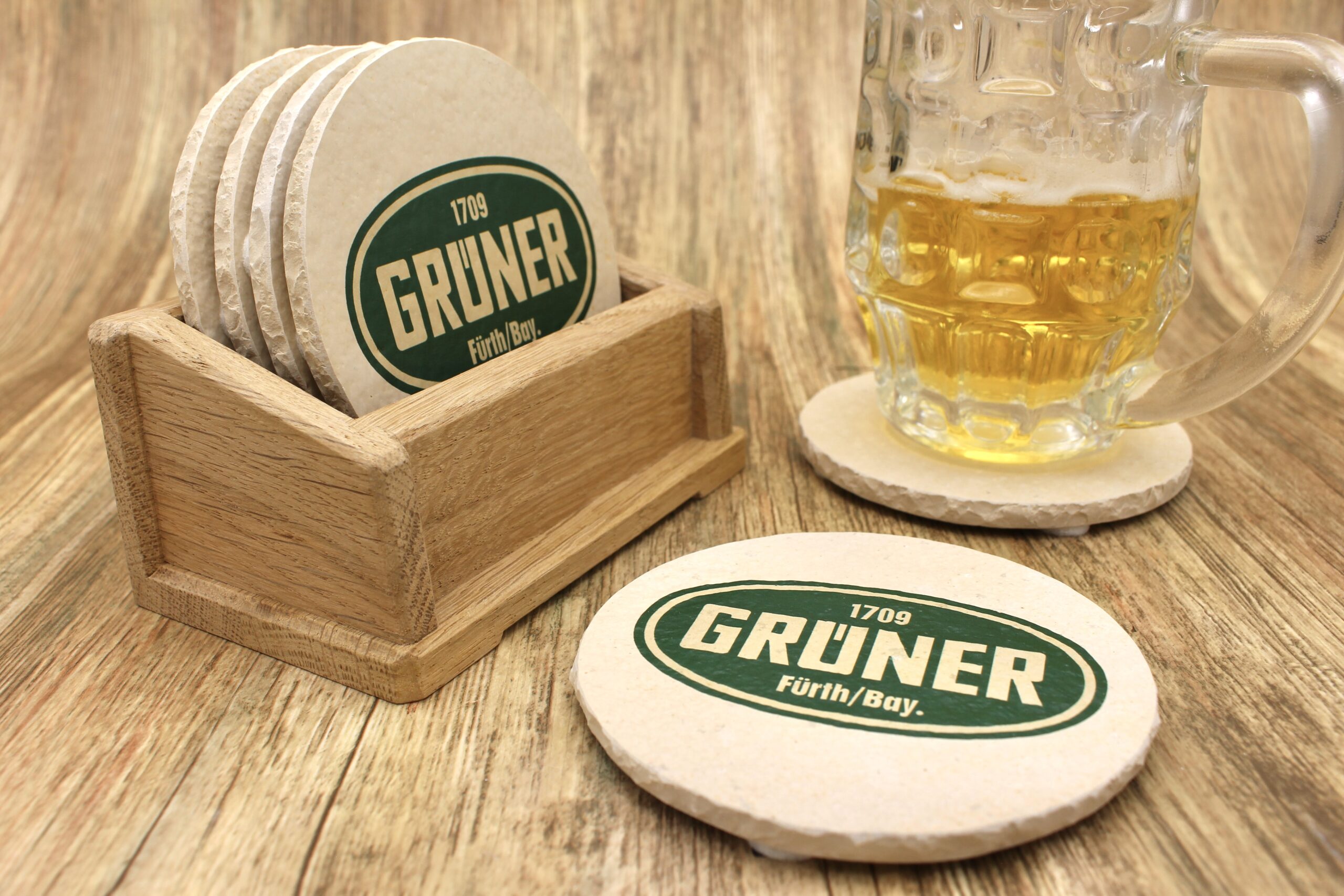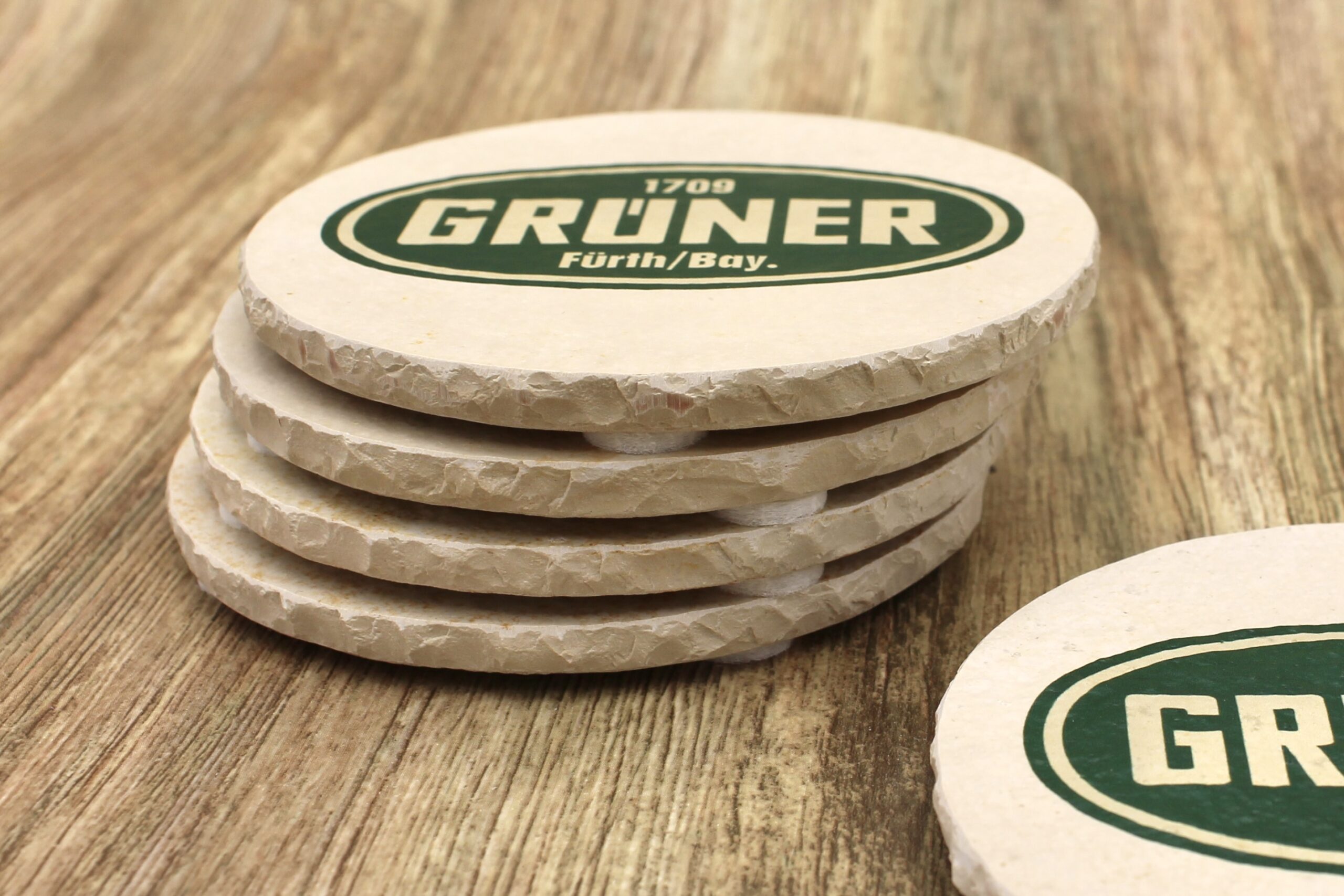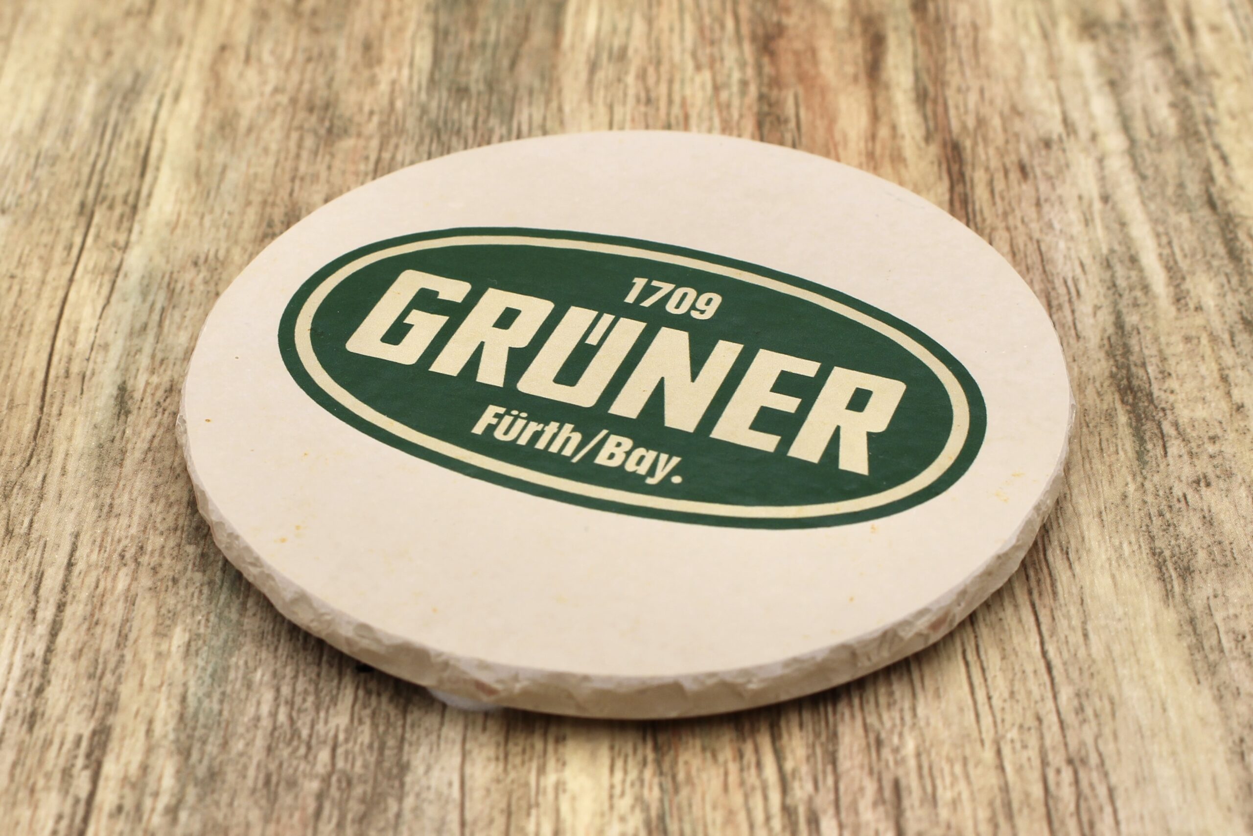 Bierdeckel aus Naturstein mit Logo der Brauerei Grüner aus Fürth ✓ Dein Fützl: perfekt als Geschenk & Fanartikel & für Sammler ✓ Echt biologisch: Aus Solnhofer Naturstein handgemacht in Bayern ➨ Jetzt bestellen!