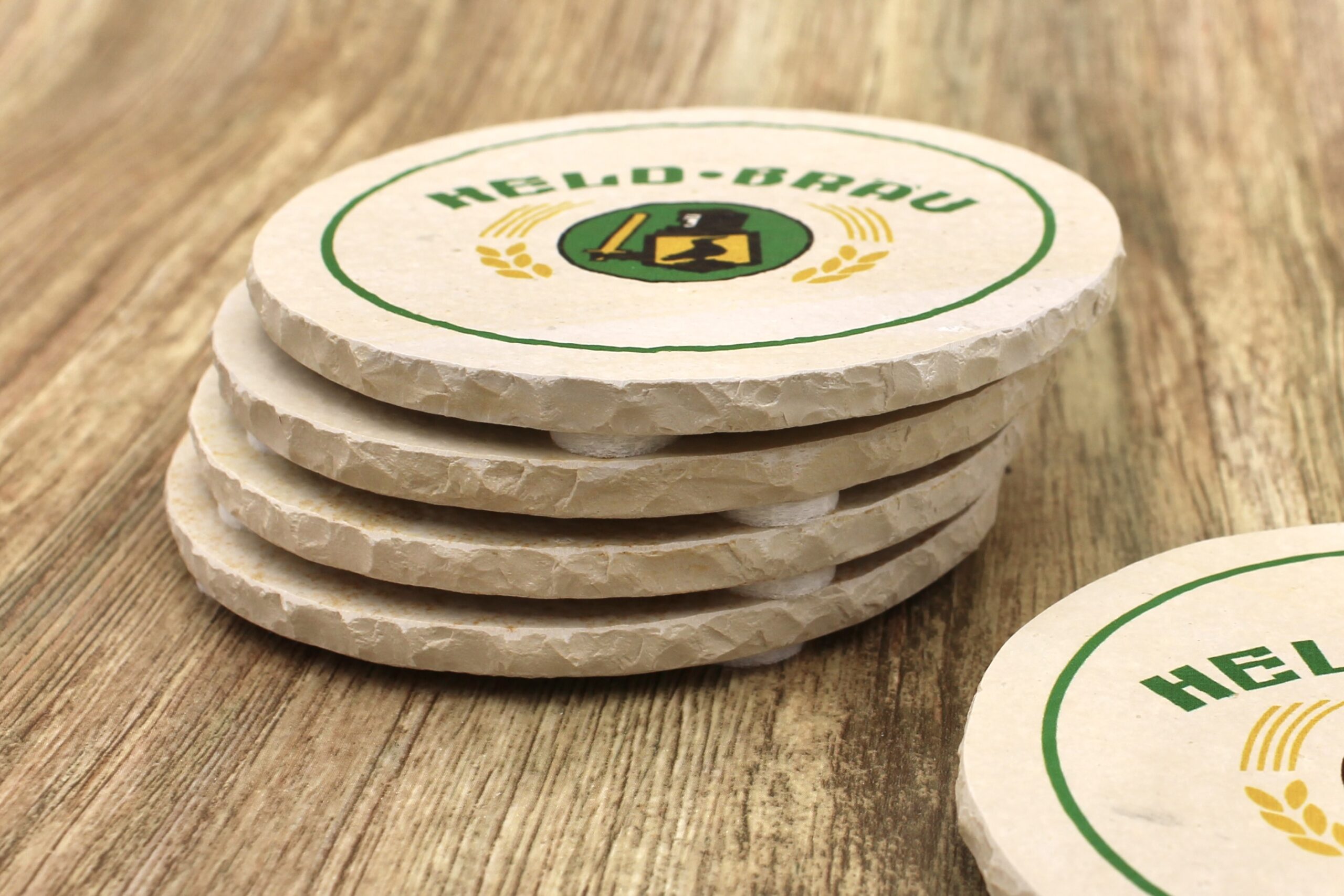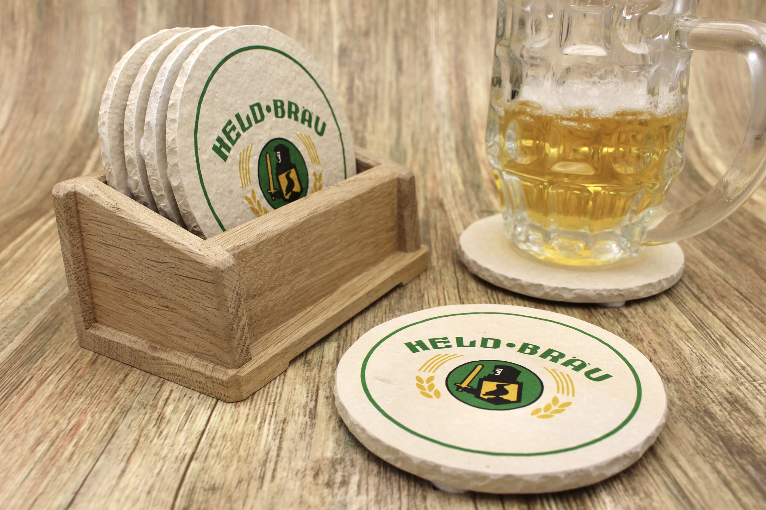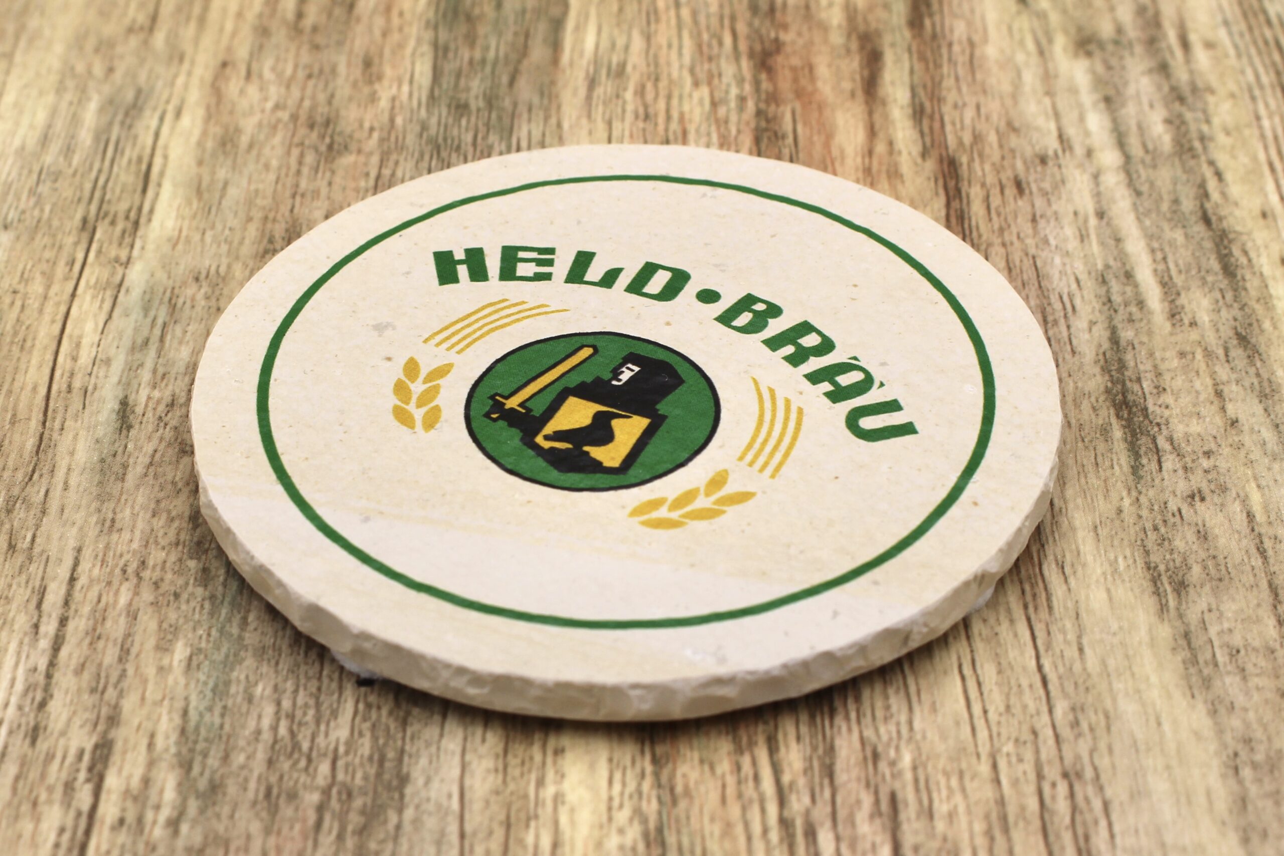 Bierdeckel aus Naturstein mit Logo der Brauerei Held Bräu aus Ahorntal ✓ Dein Fützl: perfekt als Geschenk & Fanartikel & für Sammler ✓ Echt biologisch: Aus Solnhofer Naturstein handgemacht in Bayern ➨ Jetzt bestellen!