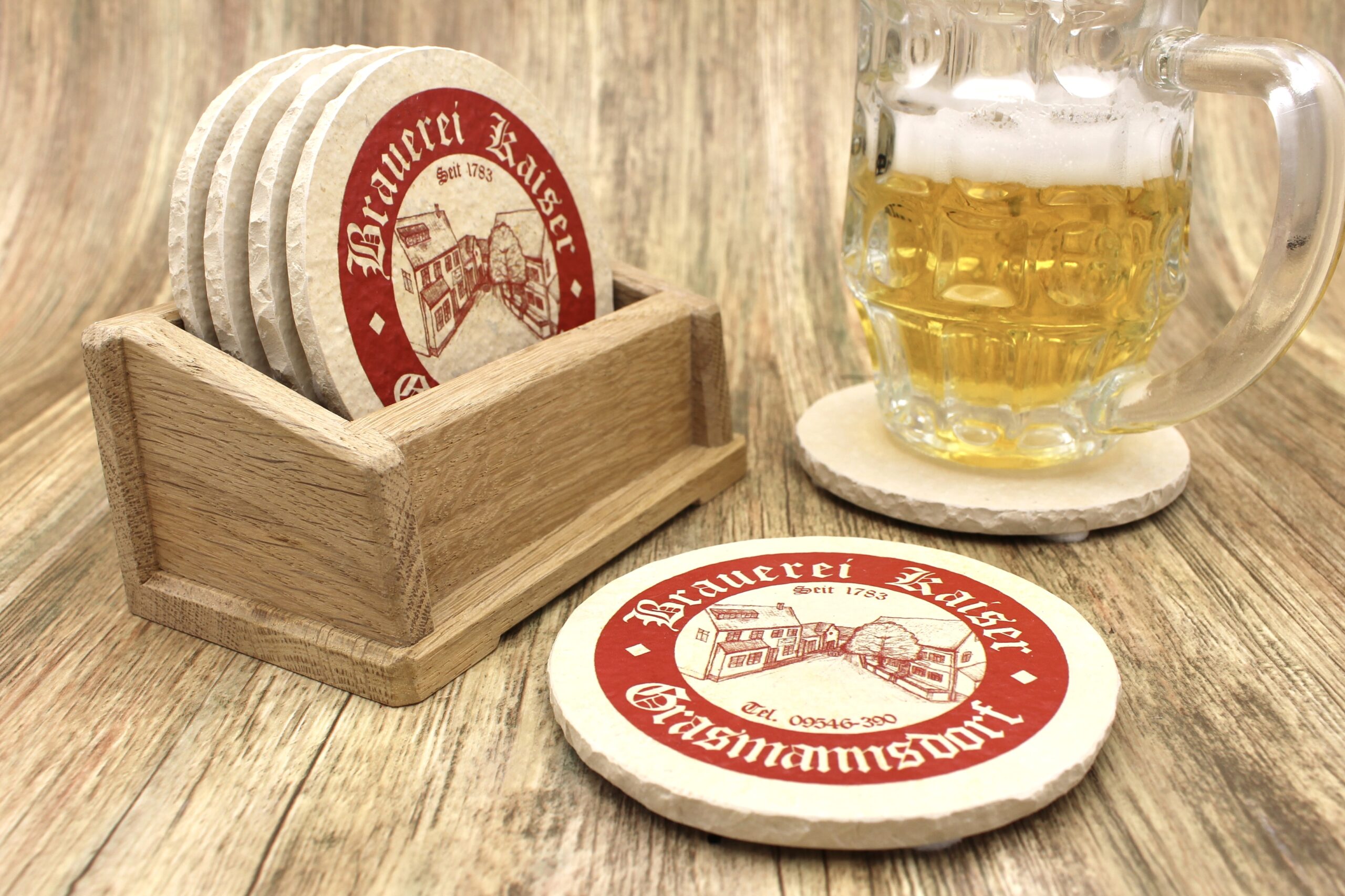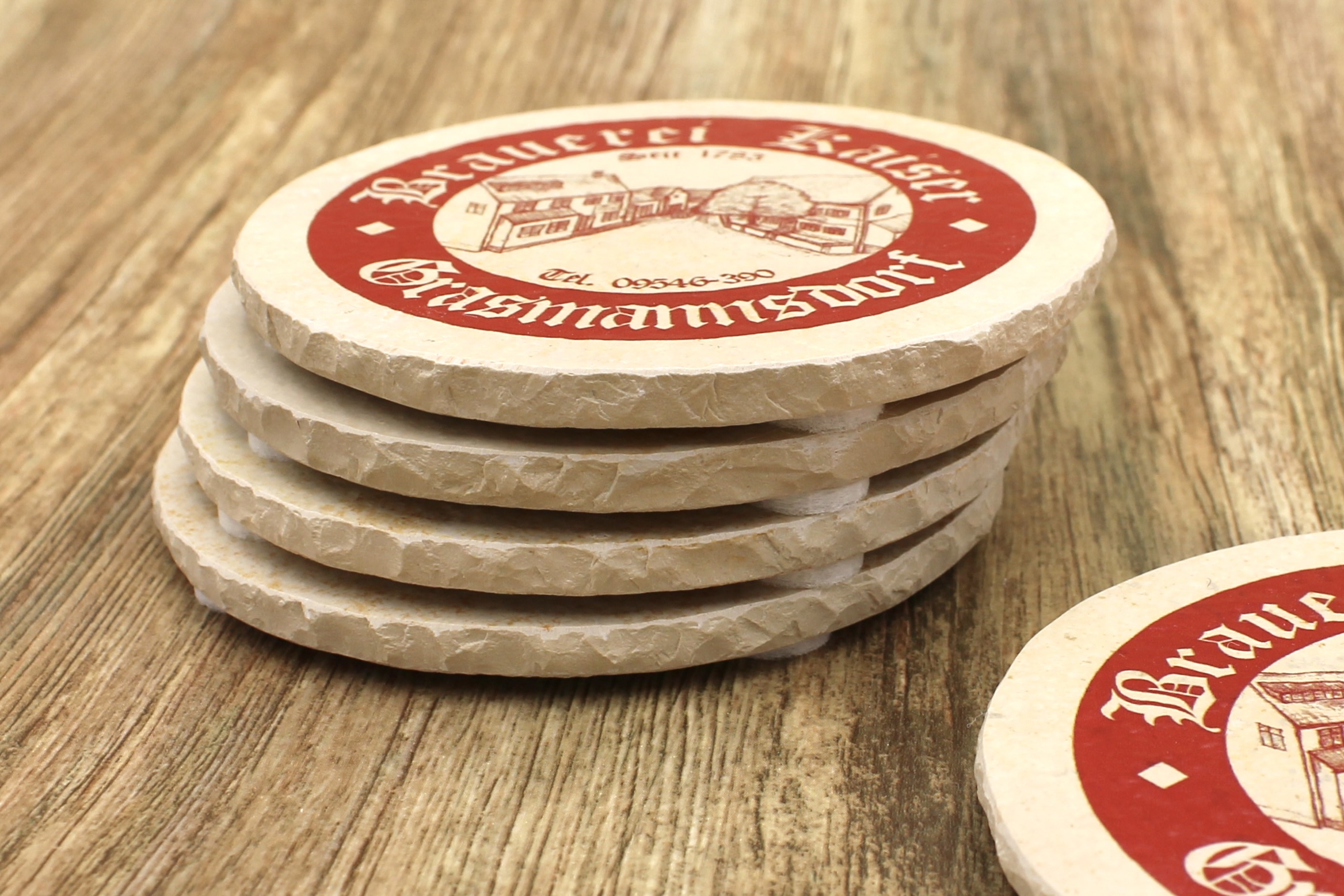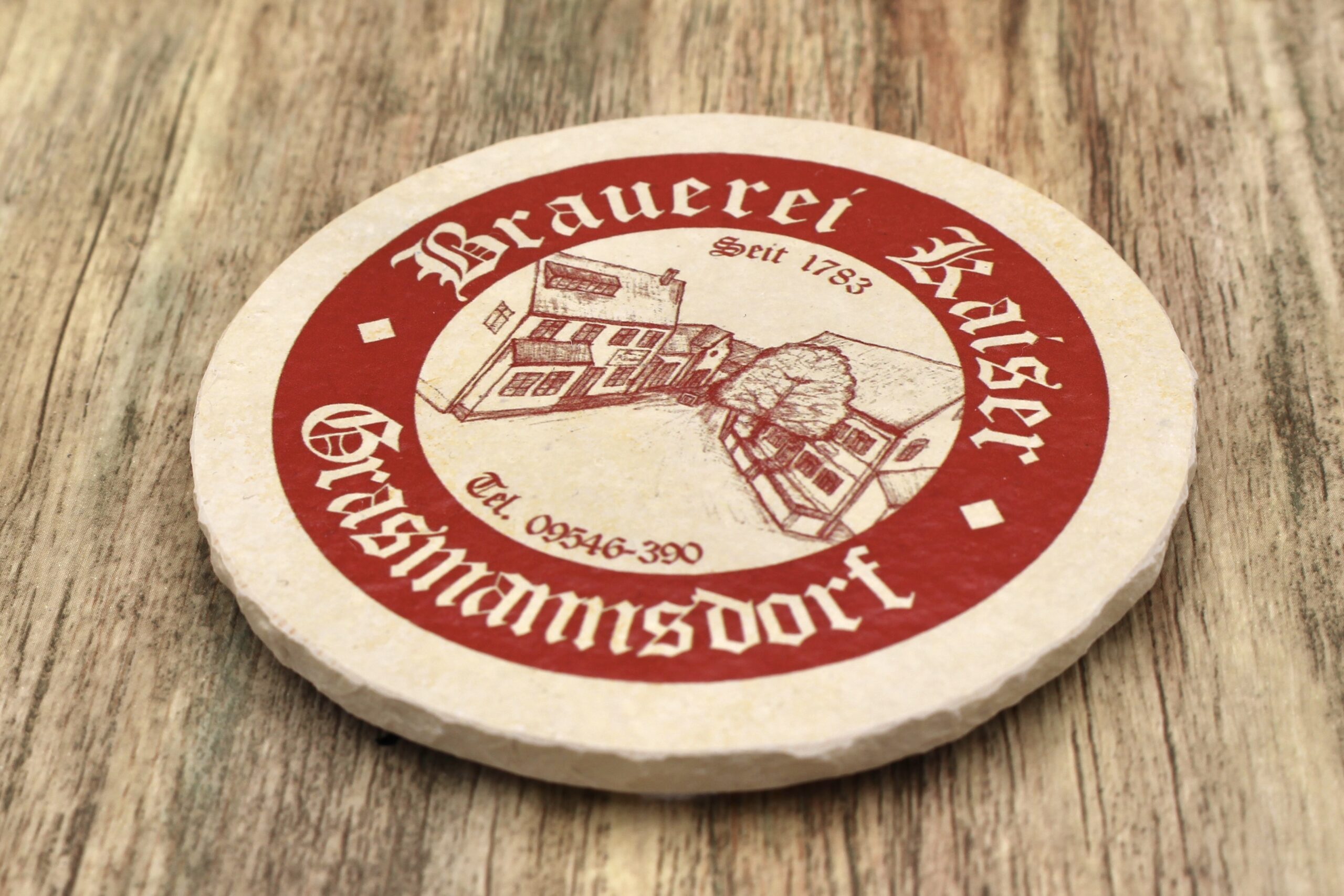Bierdeckel aus Naturstein mit Logo der Brauerei Kaiser in Grasmannsdorf ✓ Dein Fützl: perfekt als Geschenk & Fanartikel & für Sammler ✓ Echt biologisch: Aus Solnhofer Naturstein handgemacht in Bayern ➨ Jetzt bestellen!