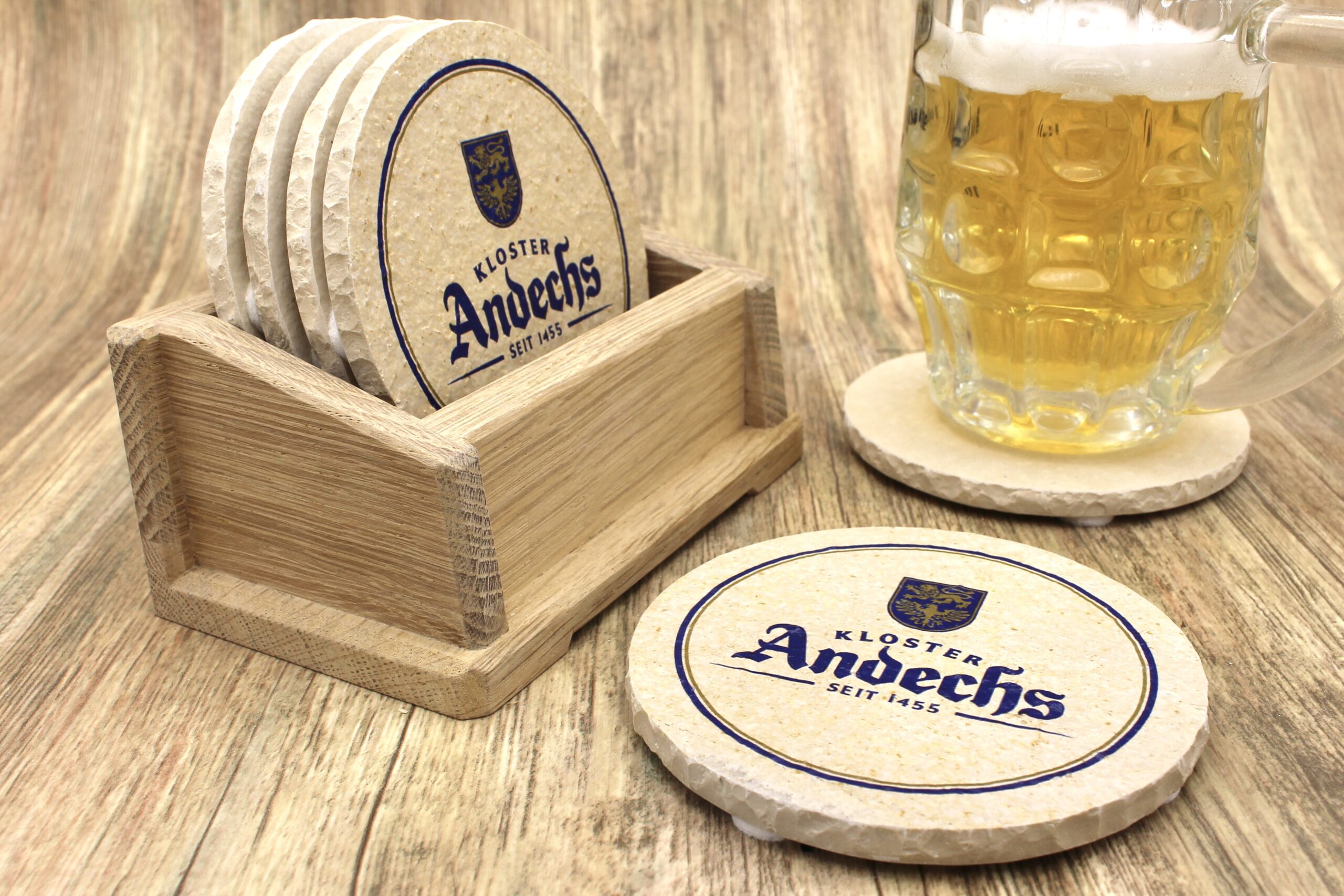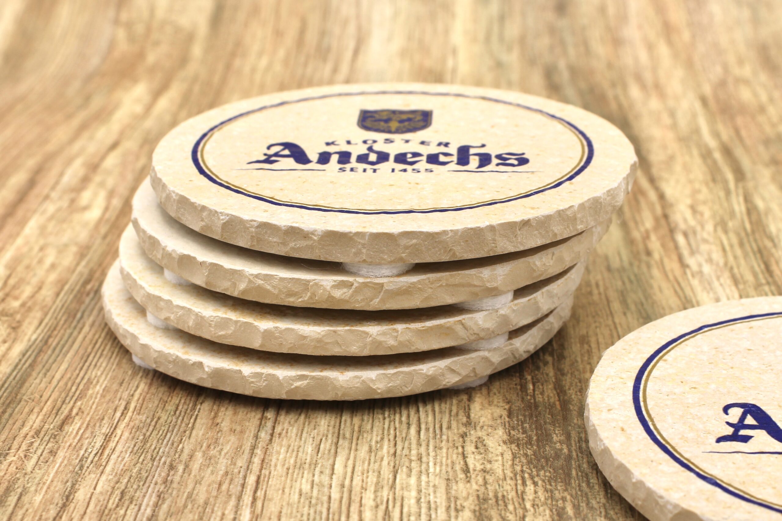 Bierdeckel aus Naturstein mit dem Logo der Klosterbrauerei Andechs ✓ Dein Fützl: perfekt als Geschenk & Fanartikel & für Sammler ✓ Echt biologisch: Aus Solnhofer Naturstein handgemacht in Bayern ➨ Jetzt bestellen!