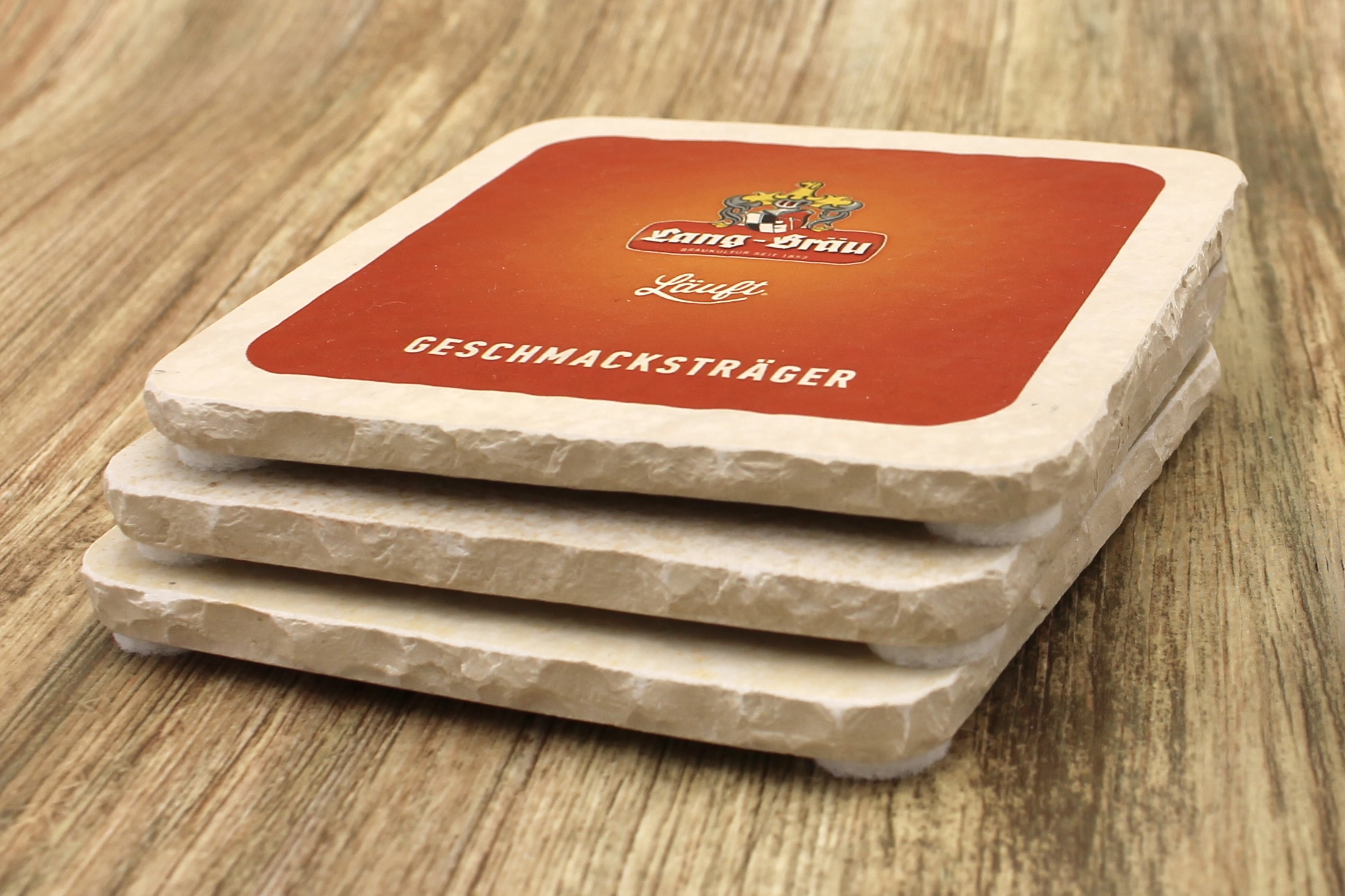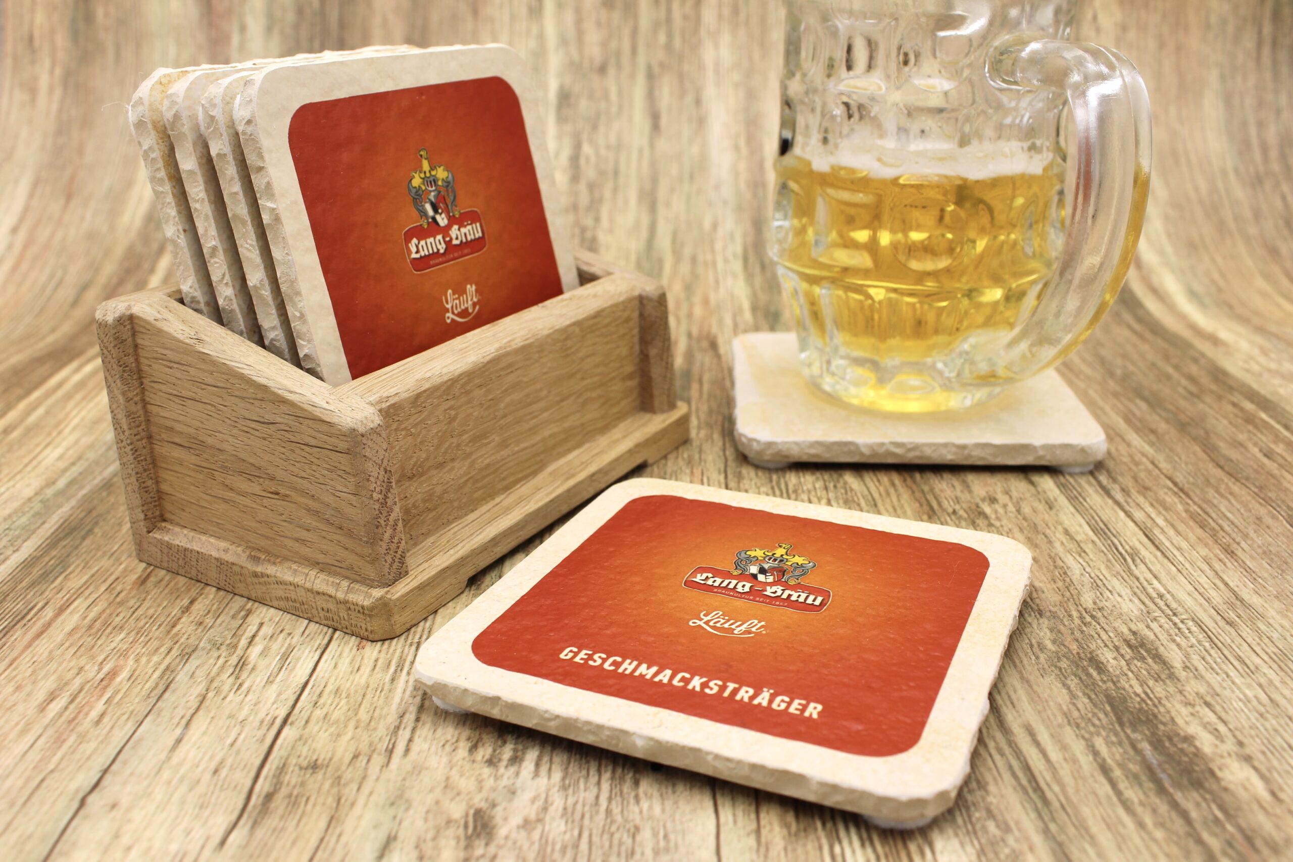 Bierdeckel aus Naturstein mit Logo der Brauerei Lang Bräu aus Wunsiedel ✓ Dein Fützl: perfekt als Geschenk & Fanartikel & für Sammler ✓ Echt biologisch: Aus Solnhofer Naturstein handgemacht in Bayern ➨ Jetzt bestellen!