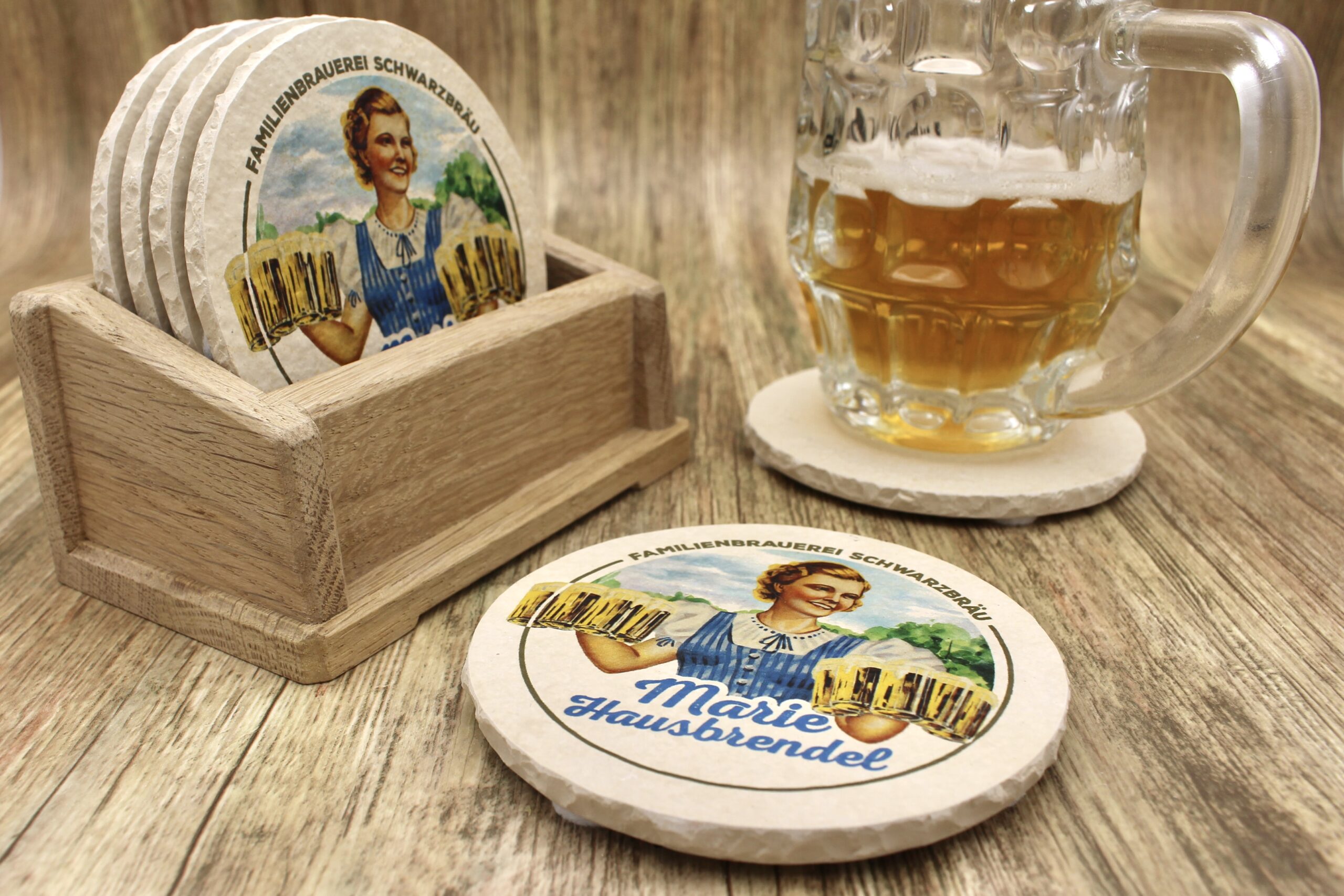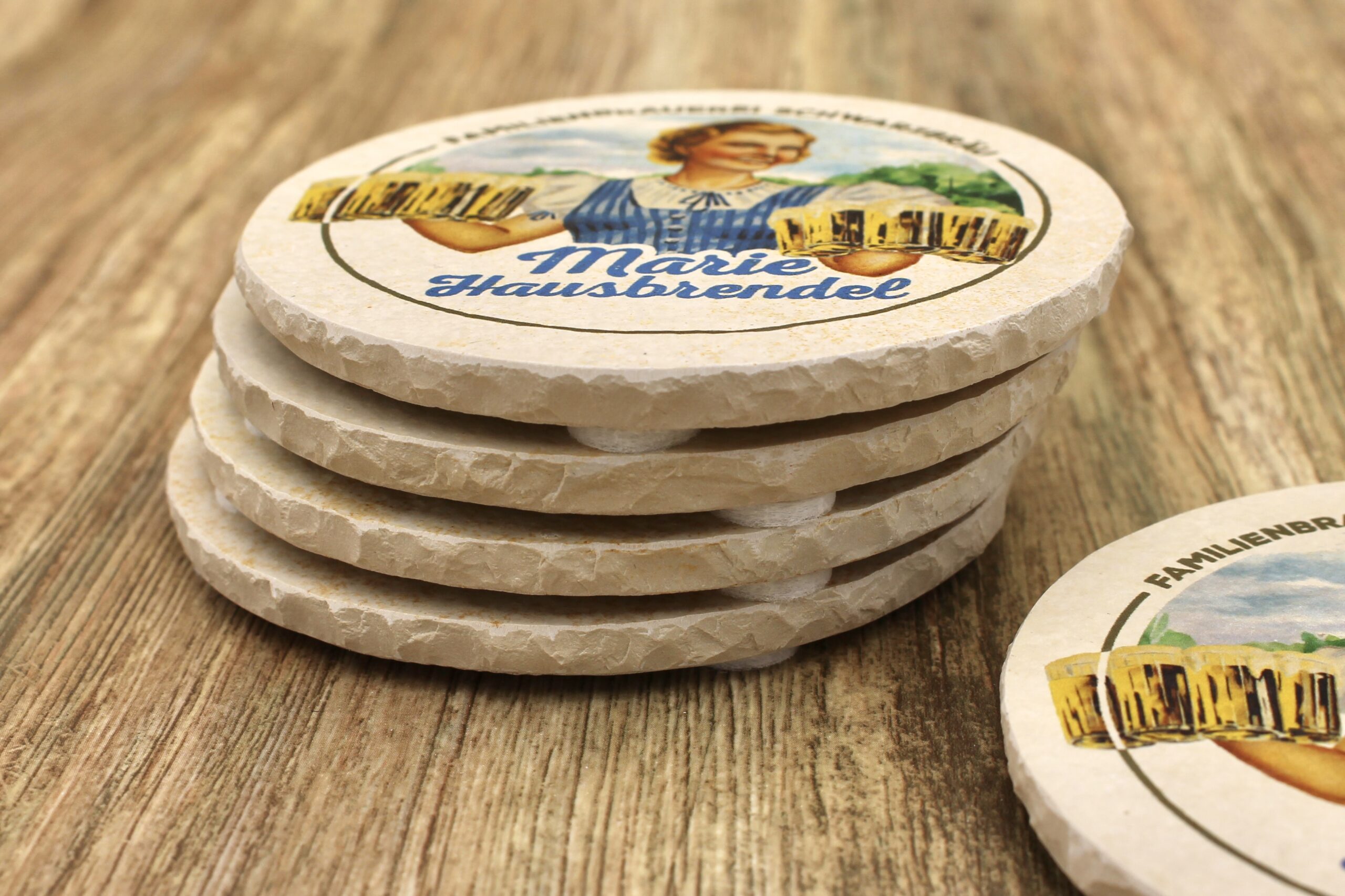 Bierdeckel aus Naturstein mit Logo der Marie Hausbrendl aus Zusmarshausen ✓ Dein Fützl: perfekt als Geschenk & Fanartikel & für Sammler ✓ Echt biologisch: Aus Solnhofer Naturstein handgemacht in Bayern ➨ Jetzt bestellen!