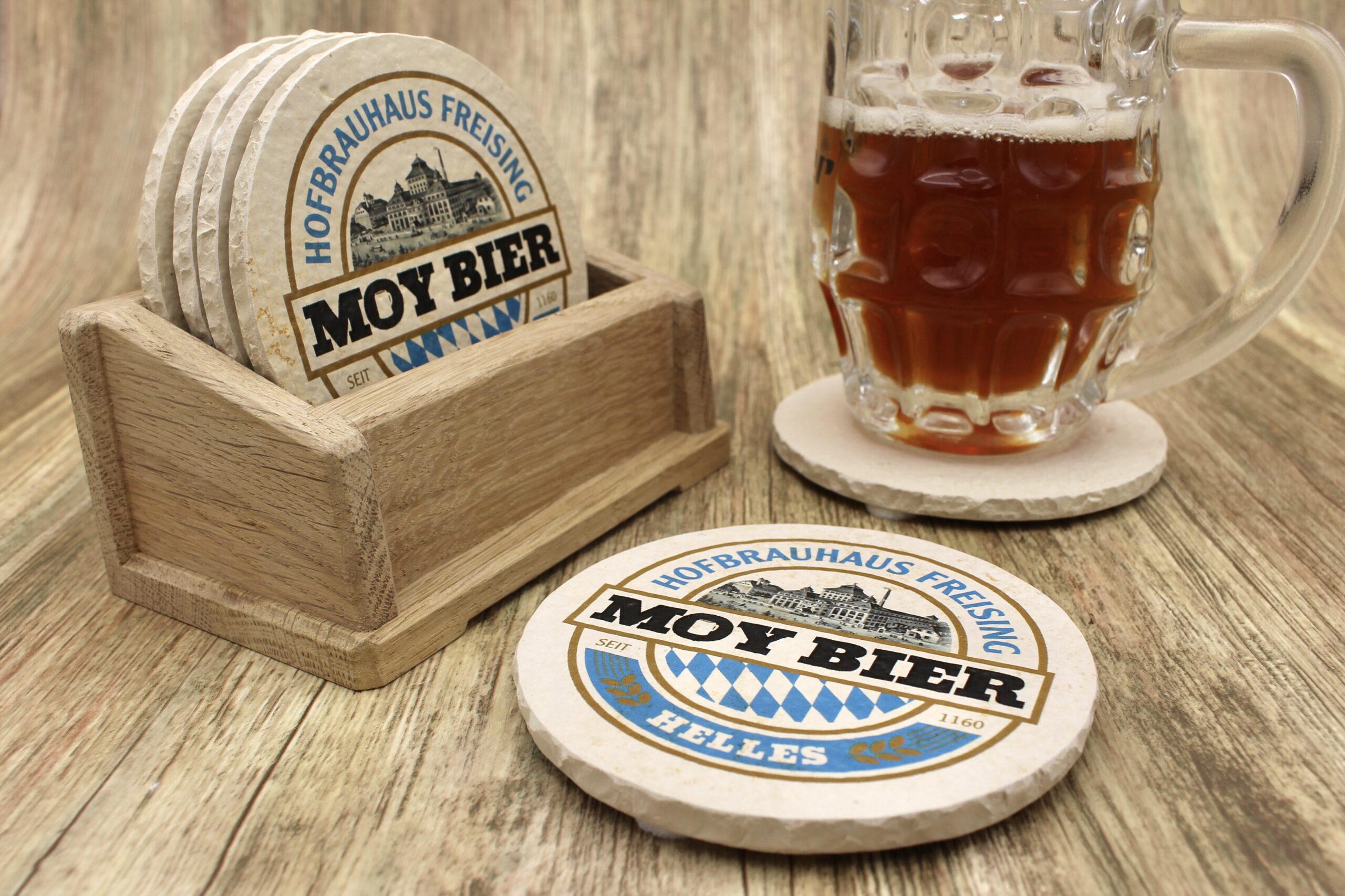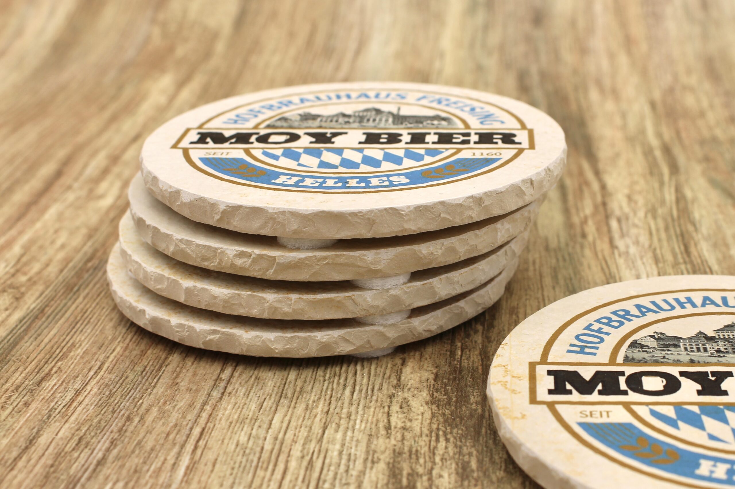 Bierdeckel aus Naturstein mit Logo des Kultbiers Moy Bier vom Hofbrauhaus Freising ✓ Dein Fützl: perfekt als Geschenk & Fanartikel & für Sammler ✓ Echt biologisch: Aus Solnhofer Naturstein handgemacht in Bayern ➨ Jetzt bestellen!