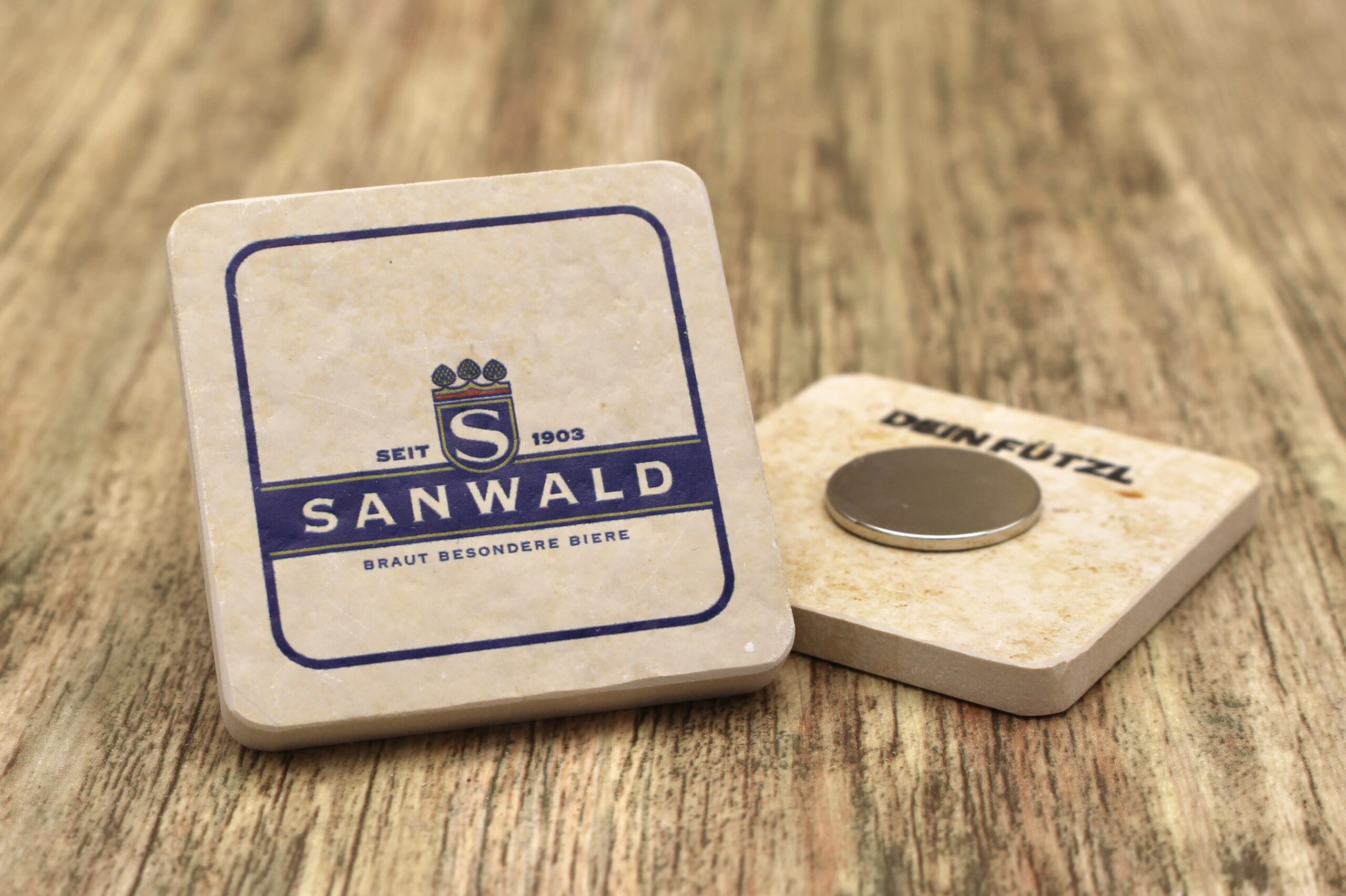 Magnet für den Kühlschrank aus Stein mit dem Logo der Brauerei Sanwald ✓ Dein Fützl: perfekt als Geschenk & Fanartikel ✓ Echt nachhaltig: Aus Solnhofer Naturstein handgemacht in Bayern ➨ Jetzt bestellen!
