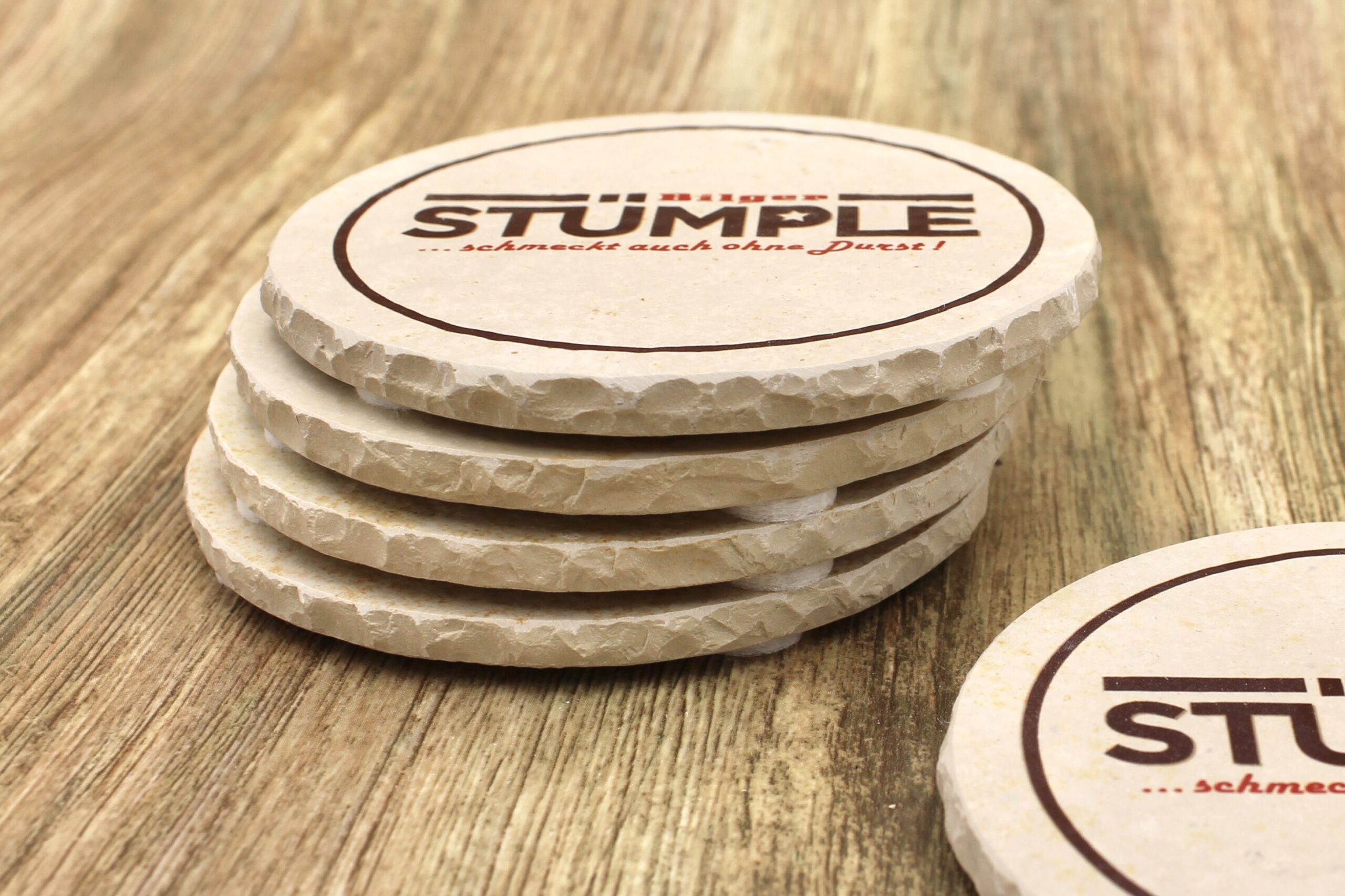Bierdeckel aus Naturstein mit Logo der Brauerei Bilger Stümple aus Donaueschingen ✓ Dein Fützl: perfekt als Geschenk & Fanartikel & für Sammler ✓ Echt biologisch: Aus Solnhofer Naturstein handgemacht in Bayern ➨ Jetzt bestellen!