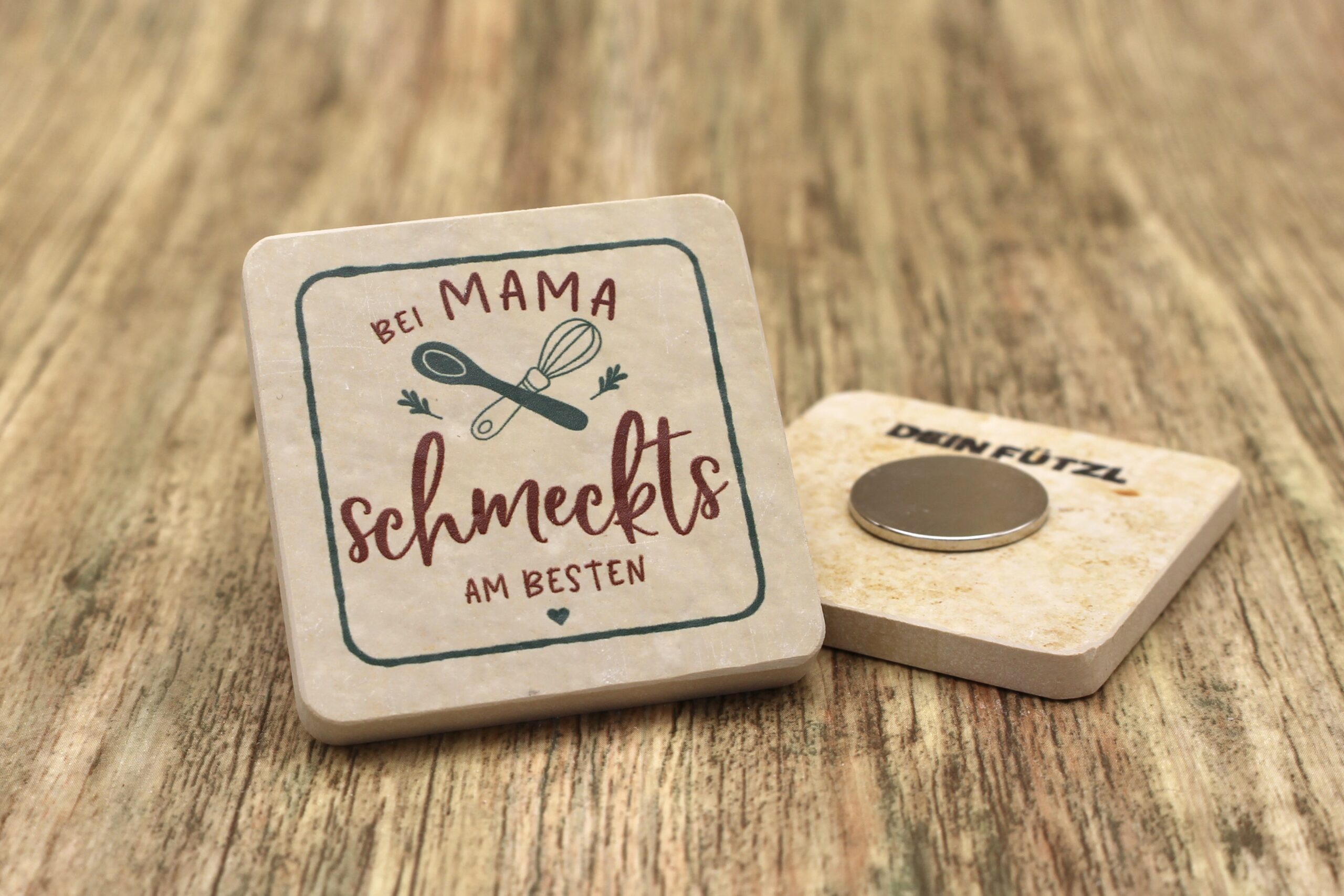 Magnet für den Kühlschrank aus Stein mit dem Motiv „Bei Mama schmeckts“ ✓ Dein Fützl: perfekt als Geschenk & Fanartikel ✓ Echt nachhaltig: Aus Solnhofer Naturstein handgemacht in Bayern ➨ Jetzt bestellen!
