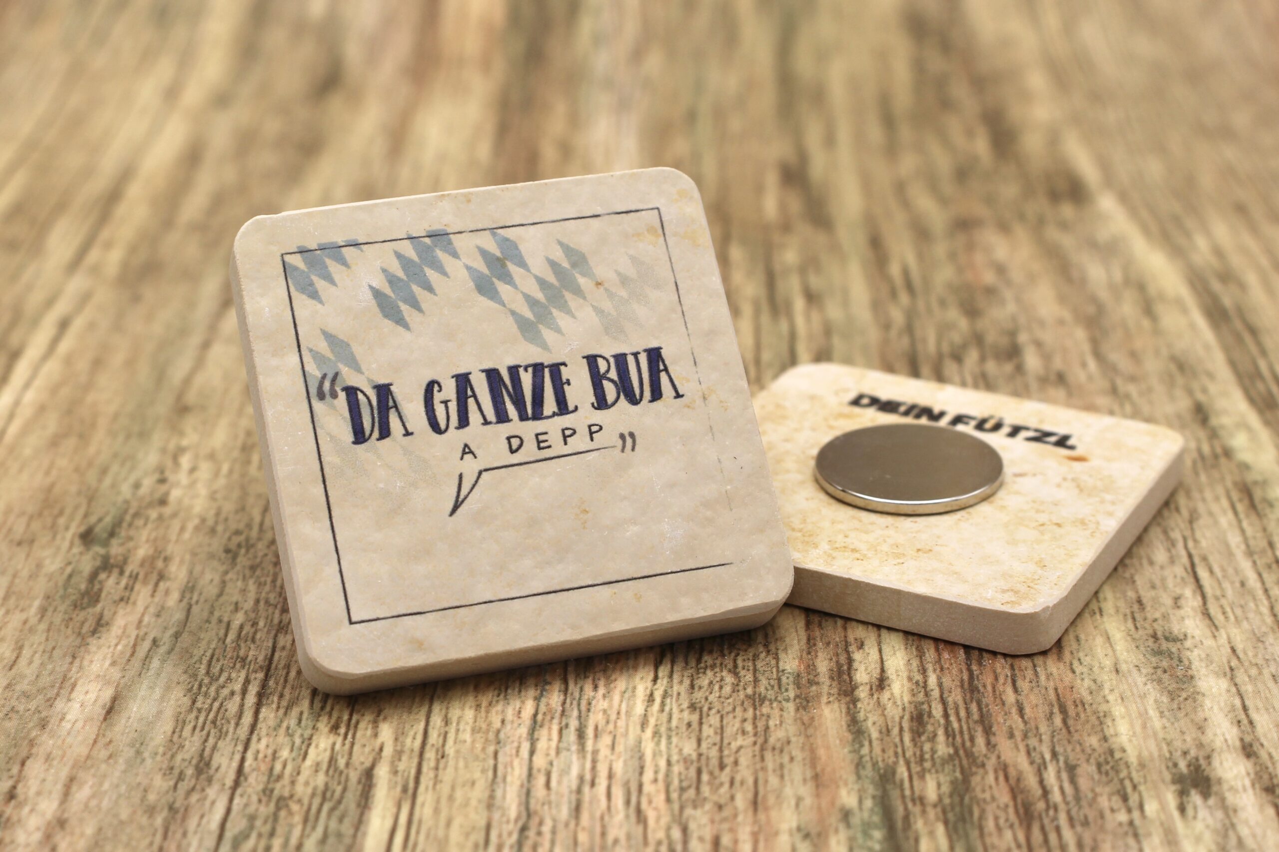 Magnet für den Kühlschrank aus Stein mit dem Motiv „Da ganze Bua a Depp“ ✓ Dein Fützl: perfekt als Geschenk & Fanartikel ✓ Echt nachhaltig: Aus Solnhofer Naturstein handgemacht in Bayern ➨ Jetzt bestellen!