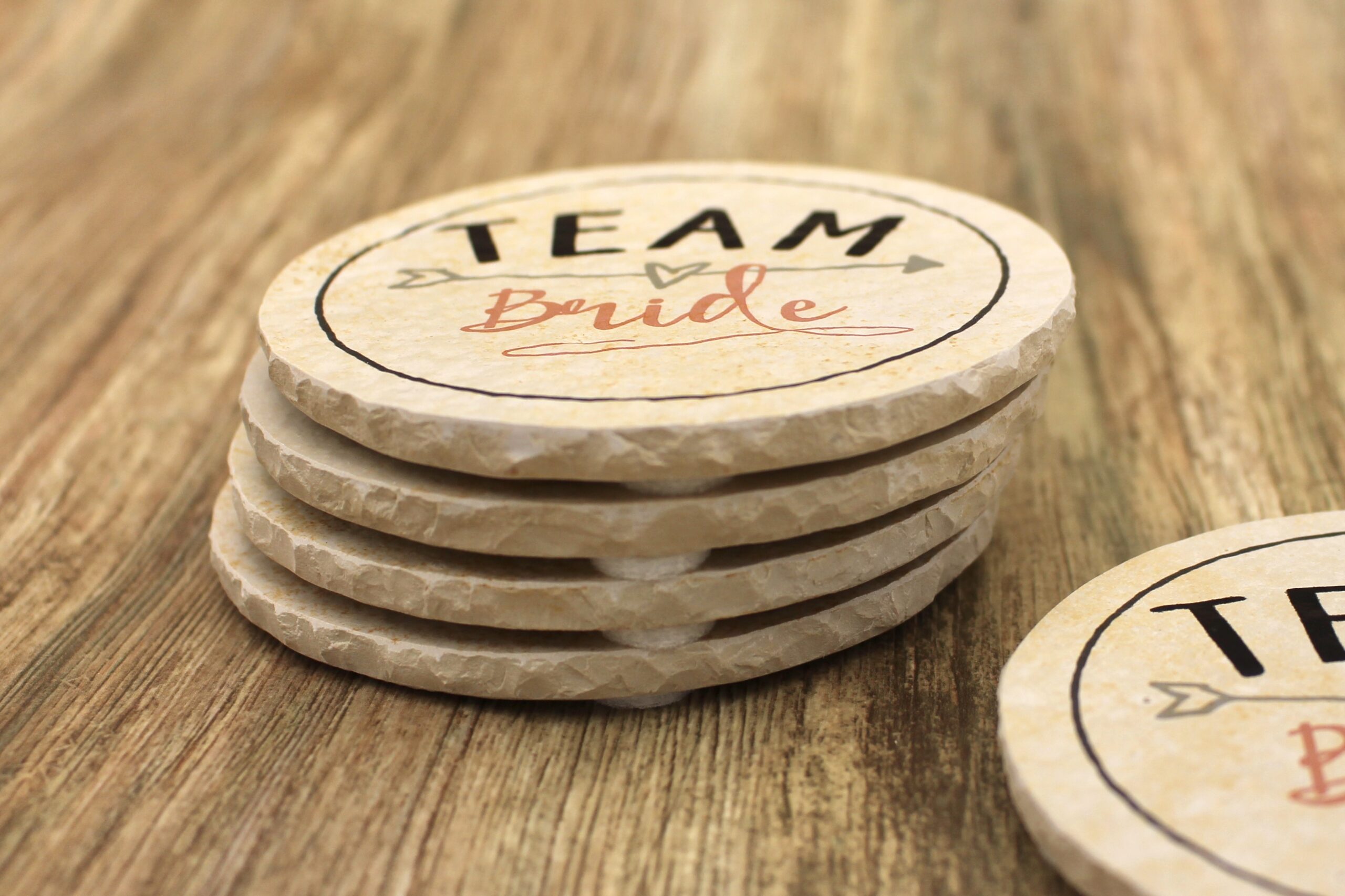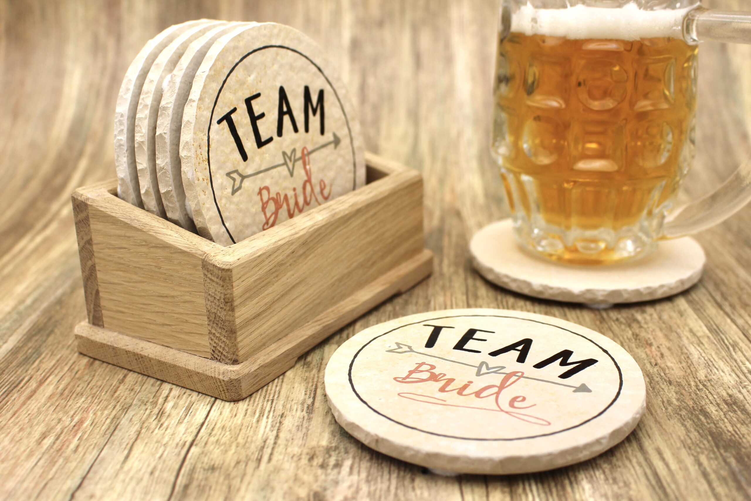 Untersetzer aus Naturstein mit dem Motiv „Team Bride“ ✓ Dein Fützl: ein persönliches Geschenk zur Hochzeit ✓ Echt biologisch: Aus Solnhofer Naturstein handgemacht in Bayern ➨ Jetzt bestellen!