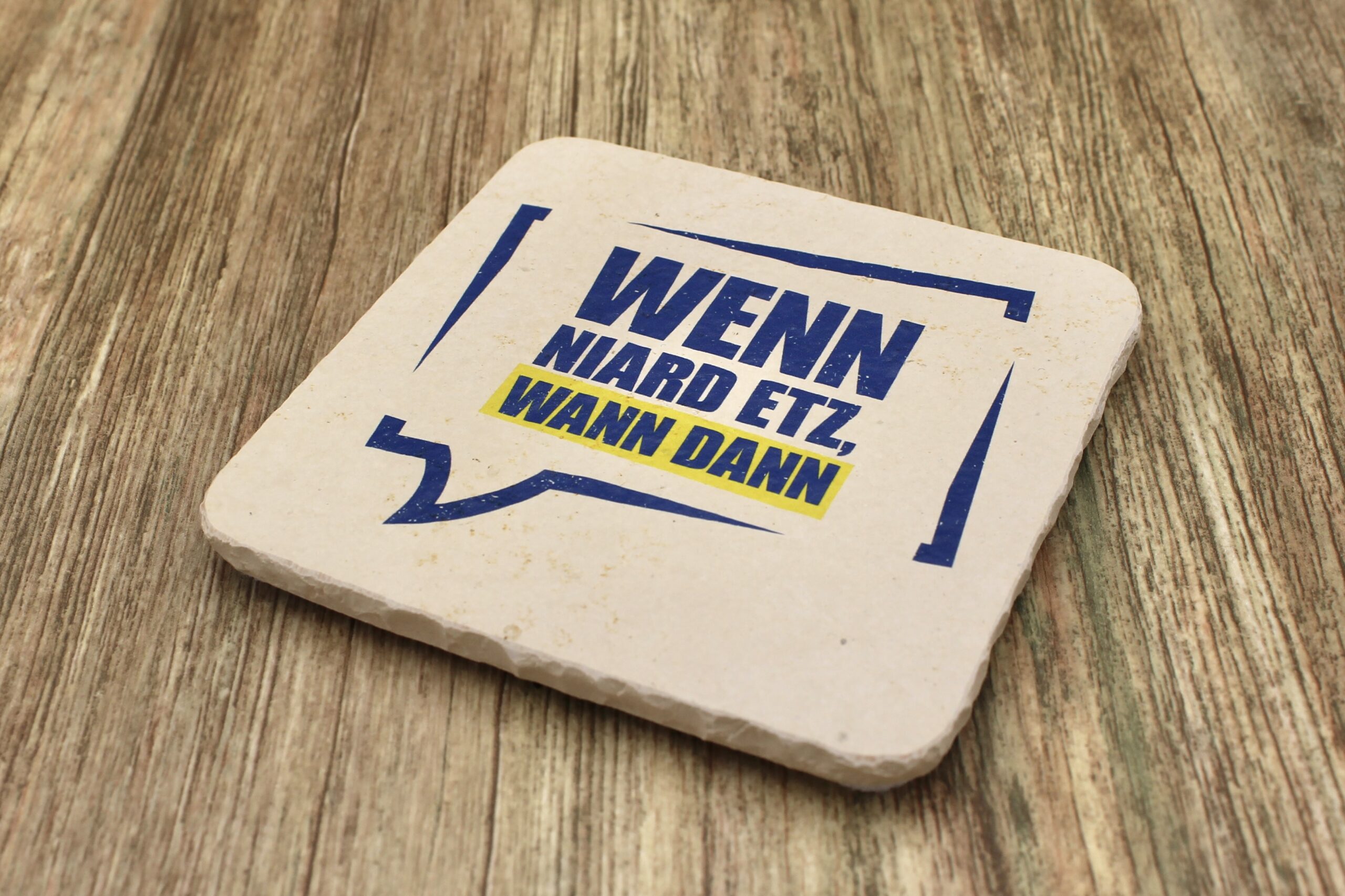 Untersetzer aus Naturstein mit dem Motiv „Wenn niard etz“. ✓ Dein Fützl: perfekt als Geschenk & Fanartikel & für Sammler ✓ Echt biologisch: Aus Solnhofer Naturstein handgemacht in Bayern ➨ Jetzt bestellen!