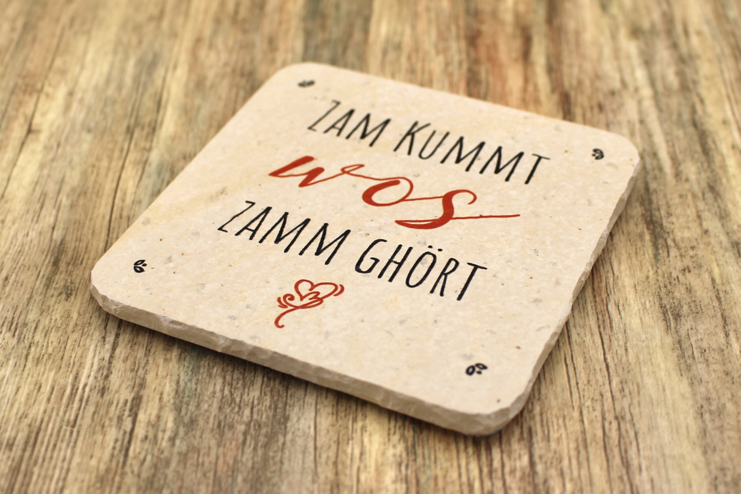 Untersetzer aus Naturstein mit dem Motiv „Zam kummt“ ✓ Dein Fützl: ein persönliches Geschenk zur Hochzeit ✓ Echt biologisch: Aus Solnhofer Naturstein handgemacht in Bayern ➨ Jetzt bestellen!