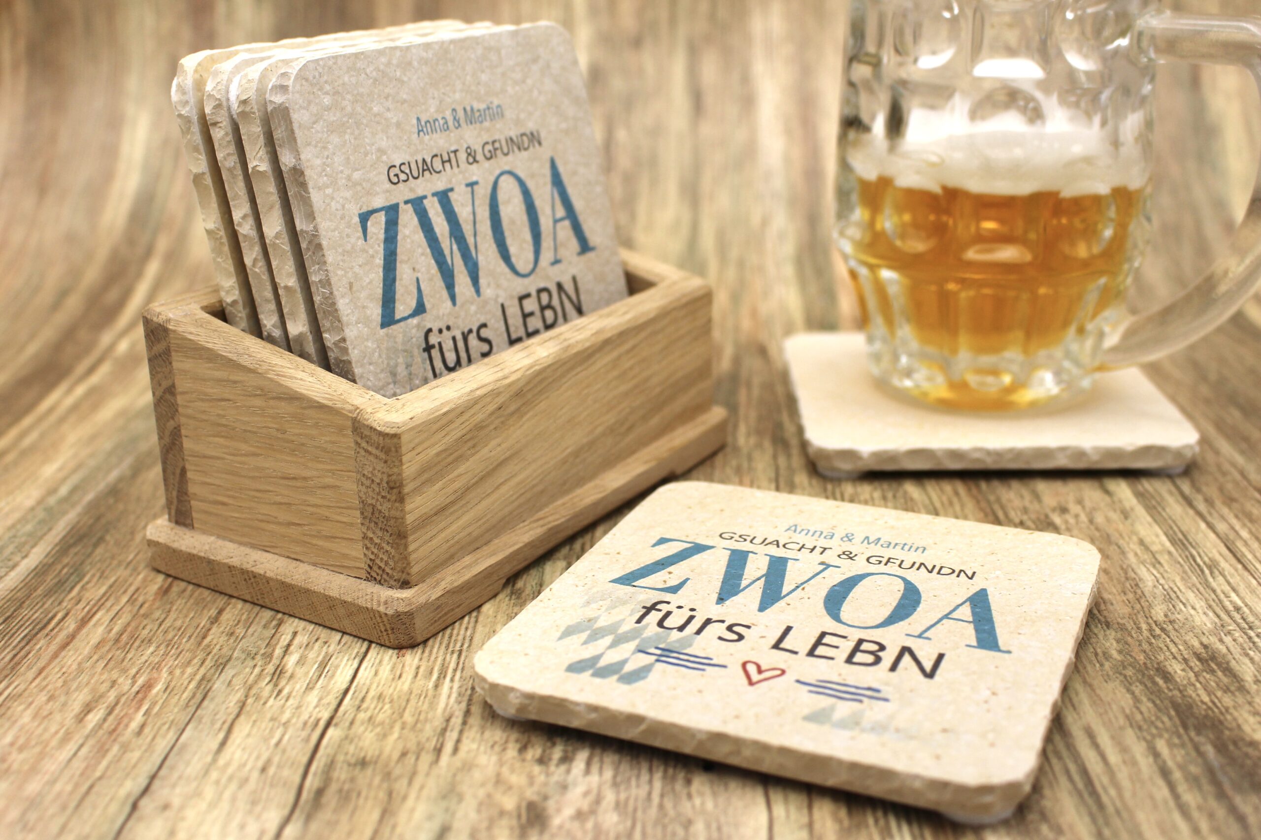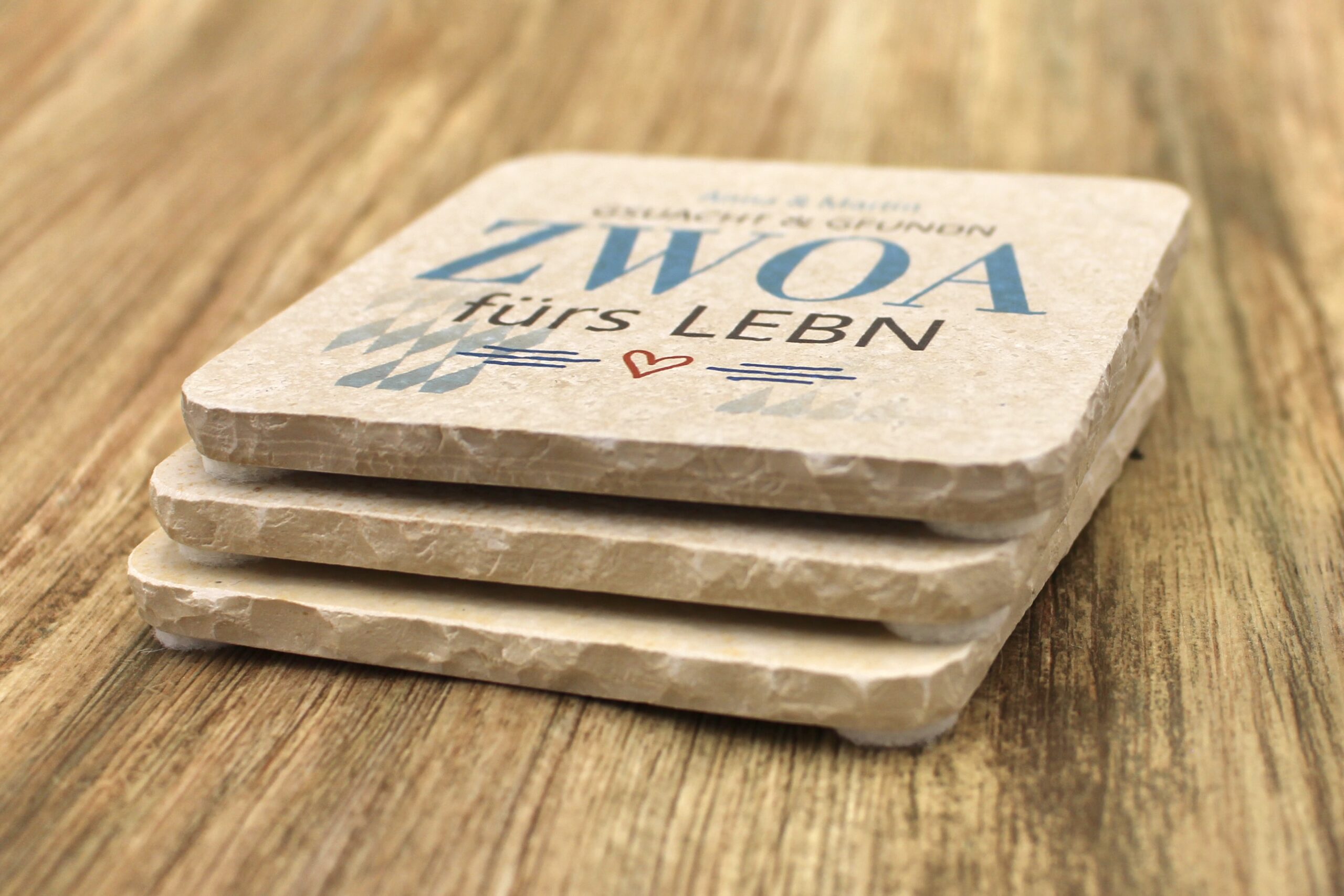 Untersetzer aus Naturstein mit dem Motiv „Zwoa fürs Lebn“ ✓ Dein Fützl: ein persönliches Geschenk zur Hochzeit ✓ Echt biologisch: Aus Solnhofer Naturstein handgemacht in Bayern ➨ Jetzt bestellen!