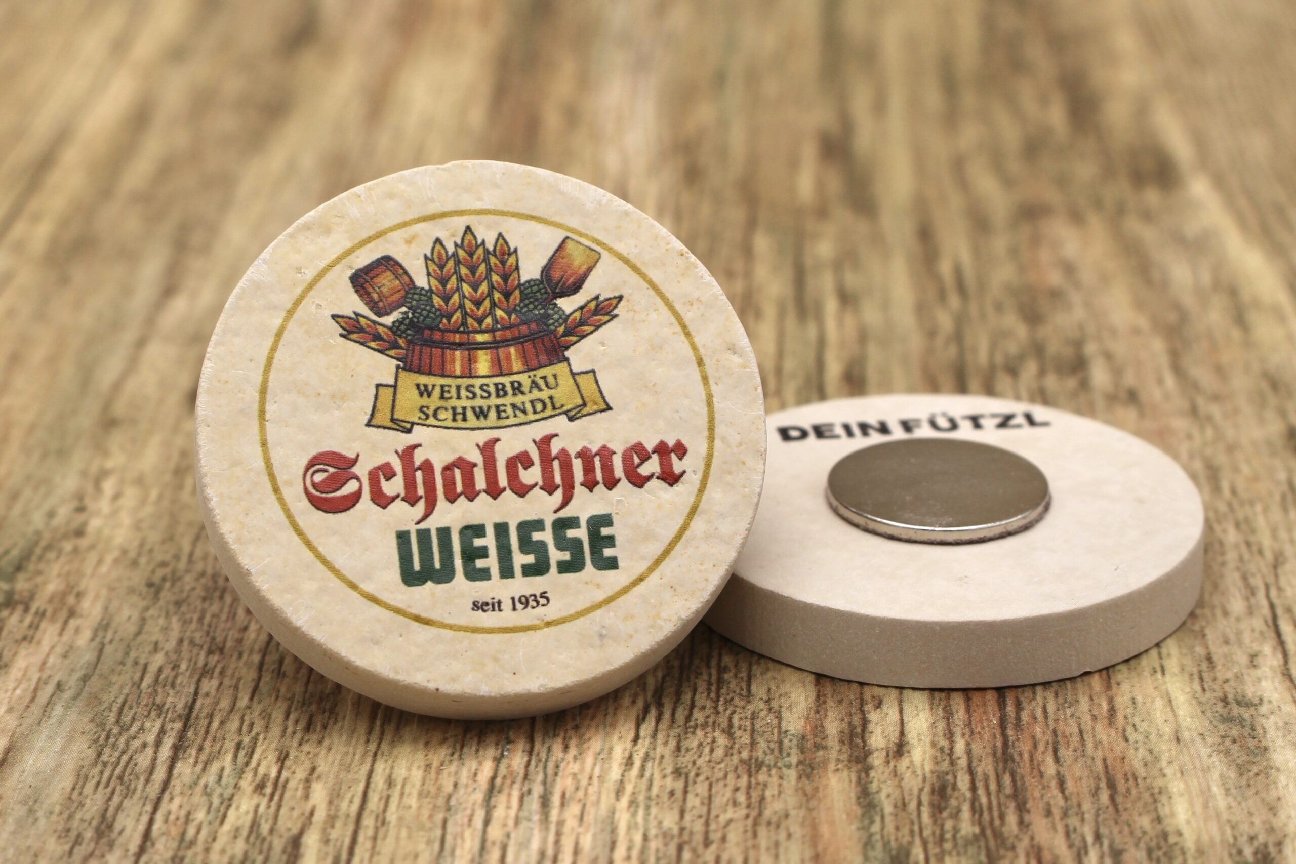 Magnet für den Kühlschrank aus Stein mit dem Logo der Brauerei Weissbräu Schwendl Schalchner Weisse ✓ Dein Fützl: perfekt als Geschenk & Fanartikel ✓ Echt nachhaltig: Aus Solnhofer Naturstein handgemacht in Bayern ➨ Jetzt bestellen!