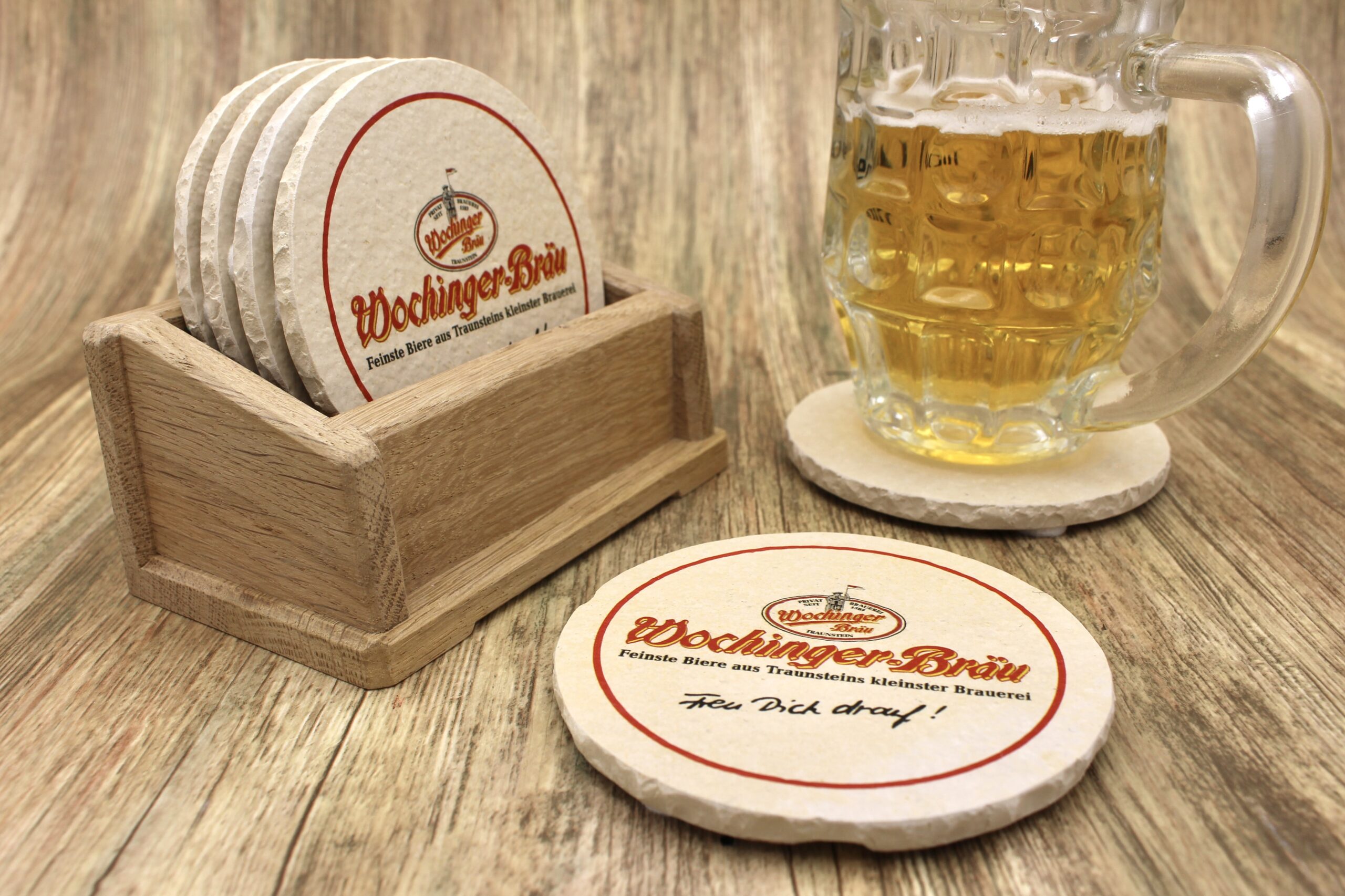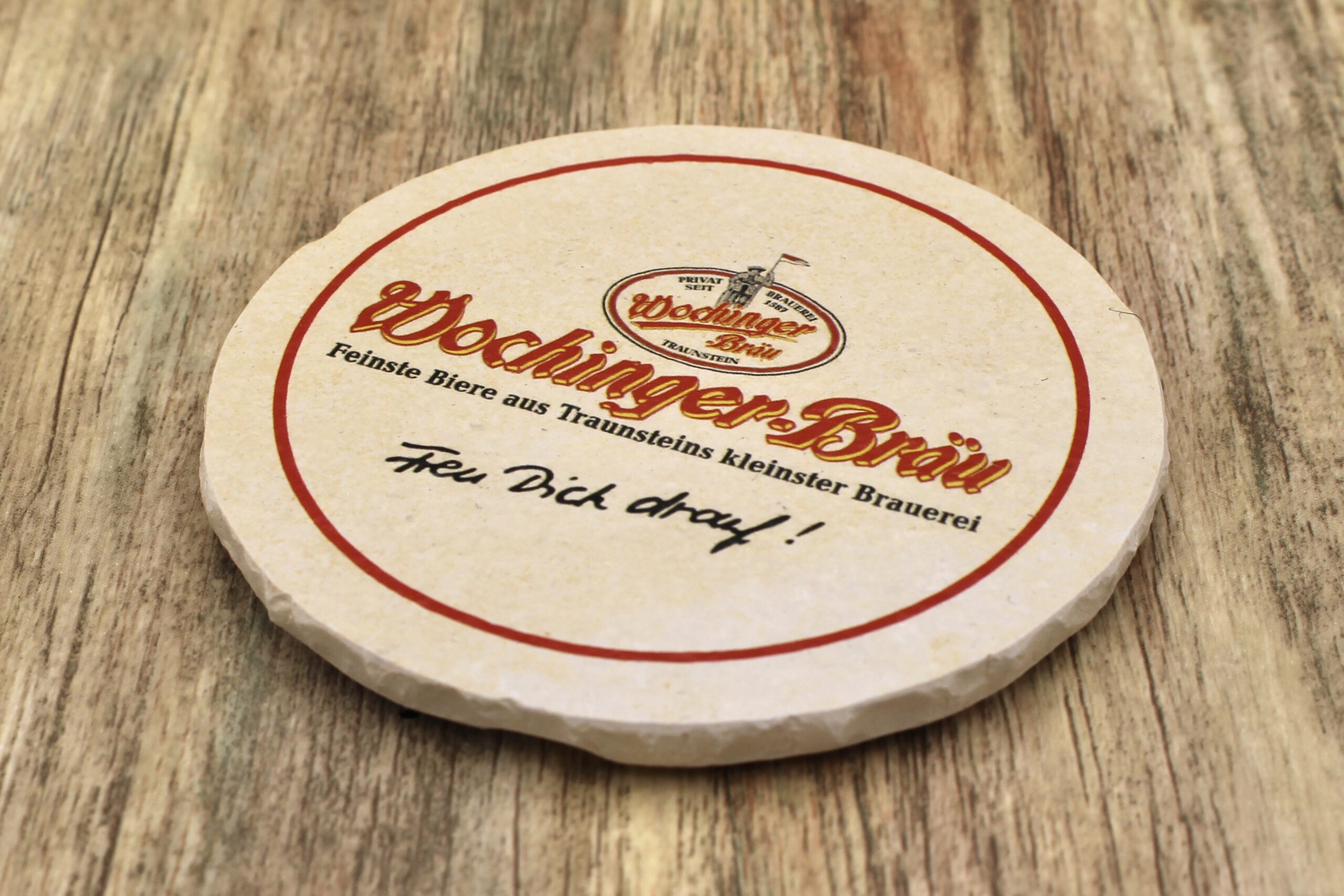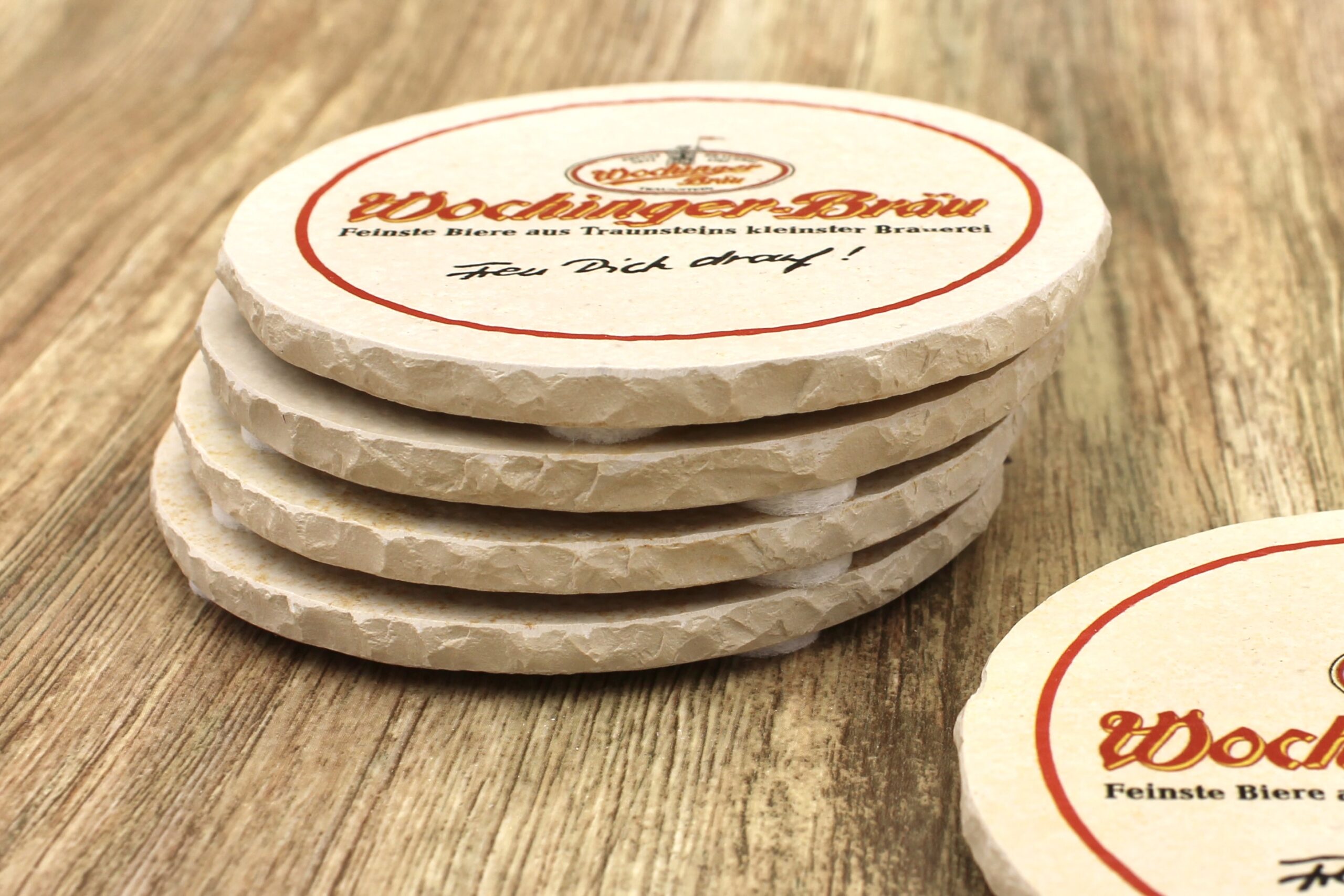Bierdeckel aus Naturstein mit Logo der Brauerei Wochinger aus Traunstein ✓ Dein Fützl: perfekt als Geschenk & Fanartikel & für Sammler ✓ Echt biologisch: Aus Solnhofer Naturstein handgemacht in Bayern ➨ Jetzt bestellen!