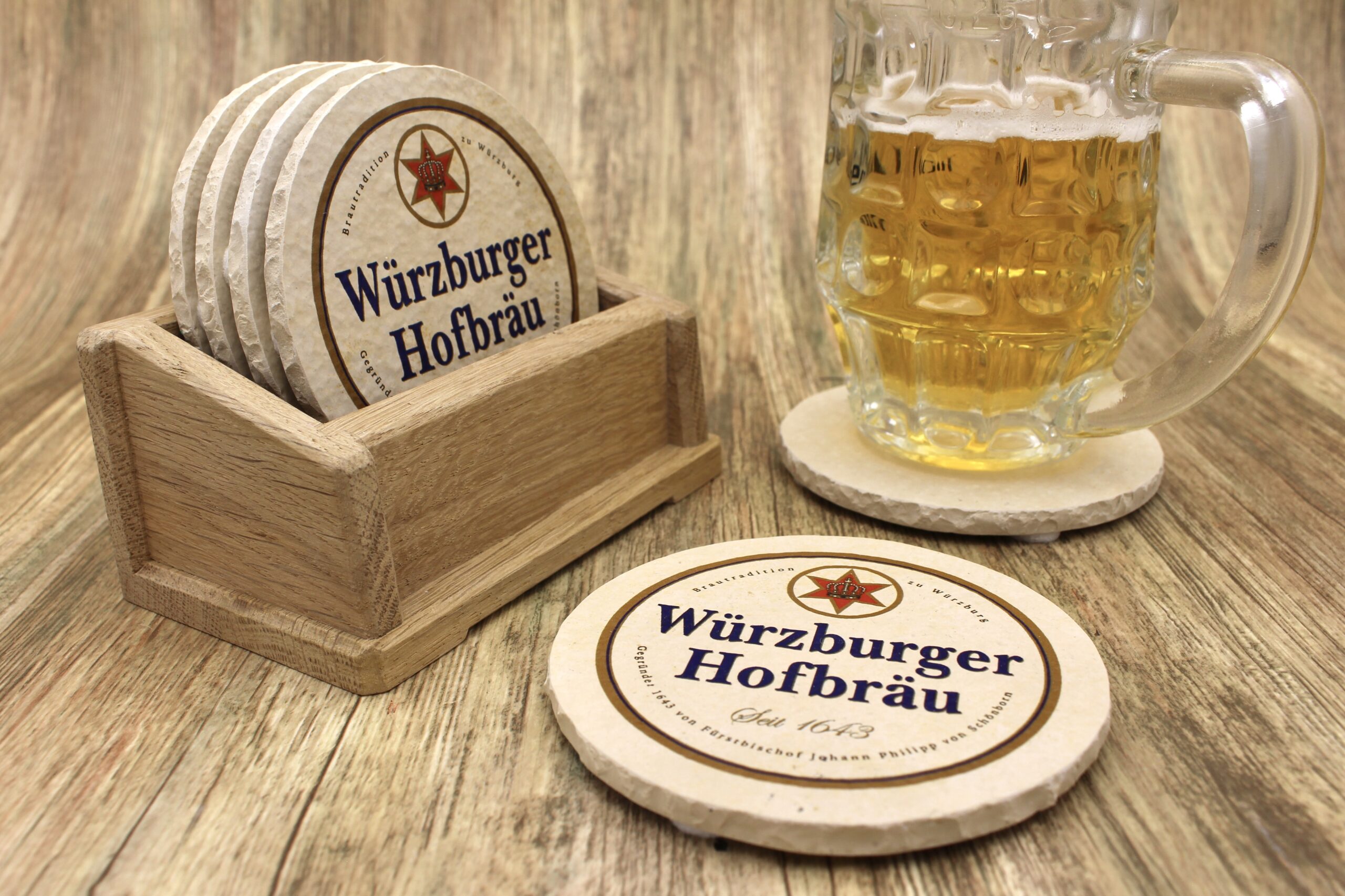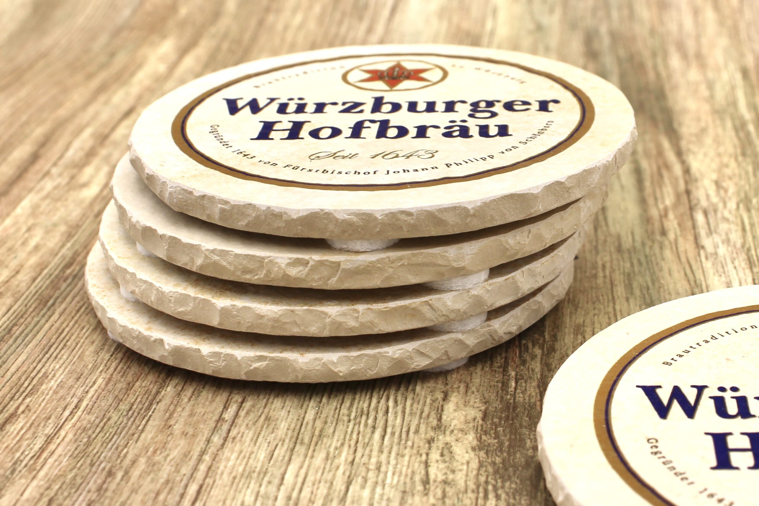 Bierdeckel aus Naturstein mit Logo des Würzburger Hofbräu ✓ Dein Fützl: perfekt als Geschenk & Fanartikel & für Sammler ✓ Echt biologisch: Aus Solnhofer Naturstein handgemacht in Bayern ➨ Jetzt bestellen!
