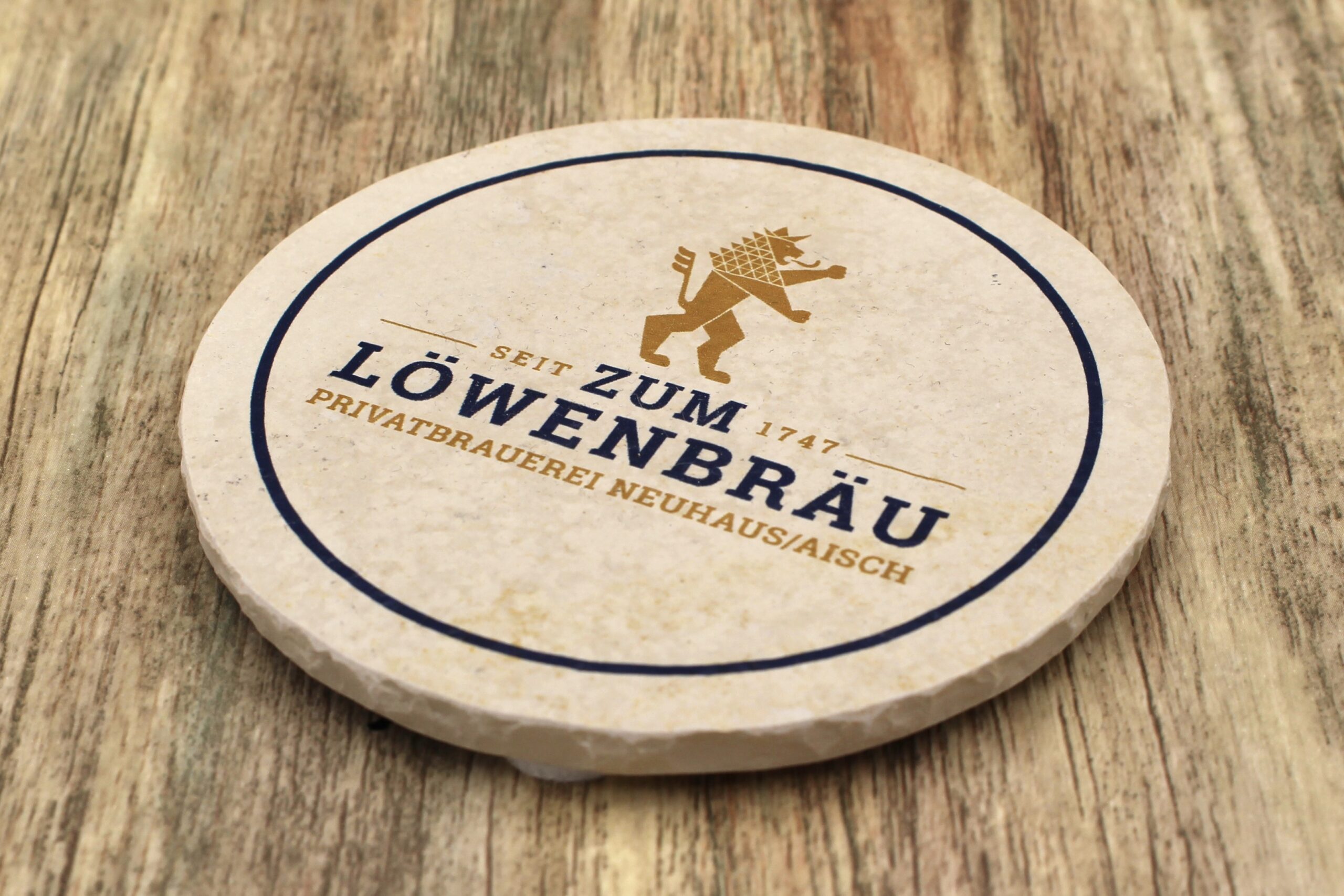 Bierdeckel aus Naturstein mit Logo der Brauerei zum Löwenbräu in Neuhaus ✓ Dein Fützl: perfekt als Geschenk & Fanartikel & für Sammler ✓ Echt biologisch: Aus Solnhofer Naturstein handgemacht in Bayern ➨ Jetzt bestellen!